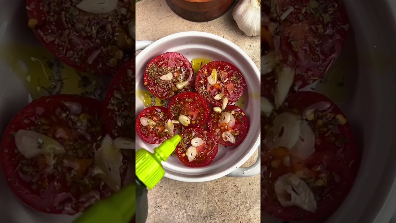 In a baking dish, place tomato halves, cut side up. Top with garlic, red pepper flakes, salt, olive oil, dried basil and Parmesan or other cheese, like Mozzarella or Gauda.