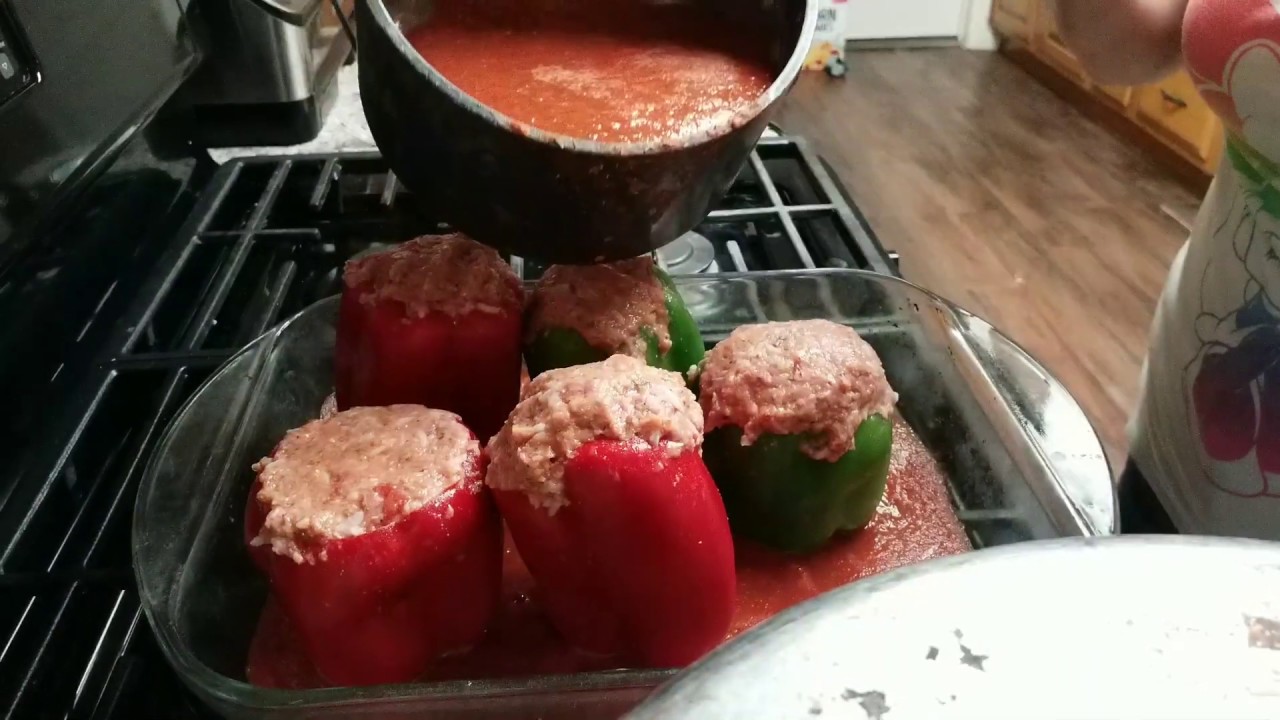 Stuff hollowed out Peppers with mixture. Put remaining sauce in Casserole dish. add peppers to casserole dish and cover tops where meat mixture is on top with ladle of sauce