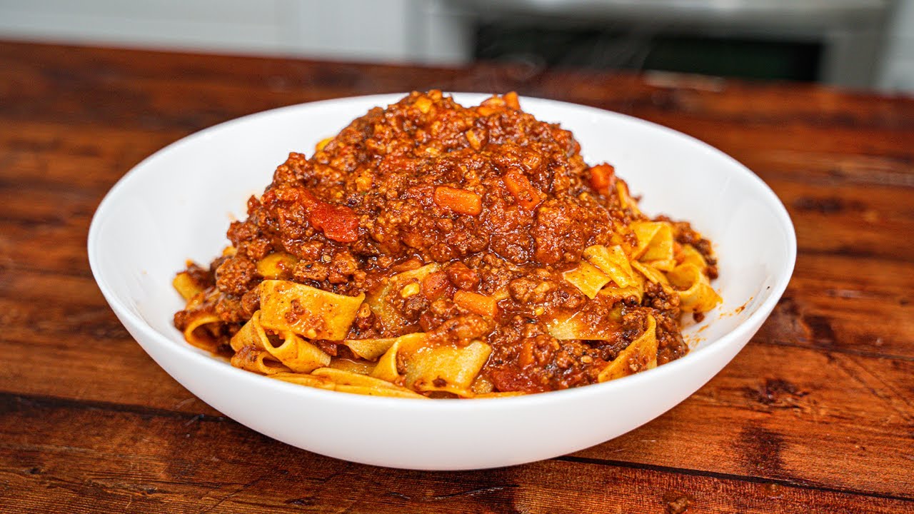 Traditional Bolognese has very little tomato in it actually — like almost none.