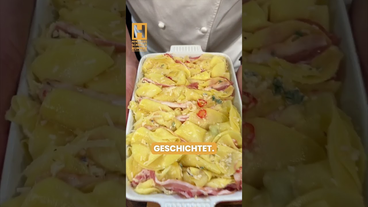 5️⃣ Kartoffeln aufrecht im Wechsel mit jeweils zwei Scheiben Bacon in eine Auflaufform schichten. Auflaufform ca. 45 Minuten in den heißen Ofen geben und Speckkartoffeln darin goldbraun und knusprig backen.