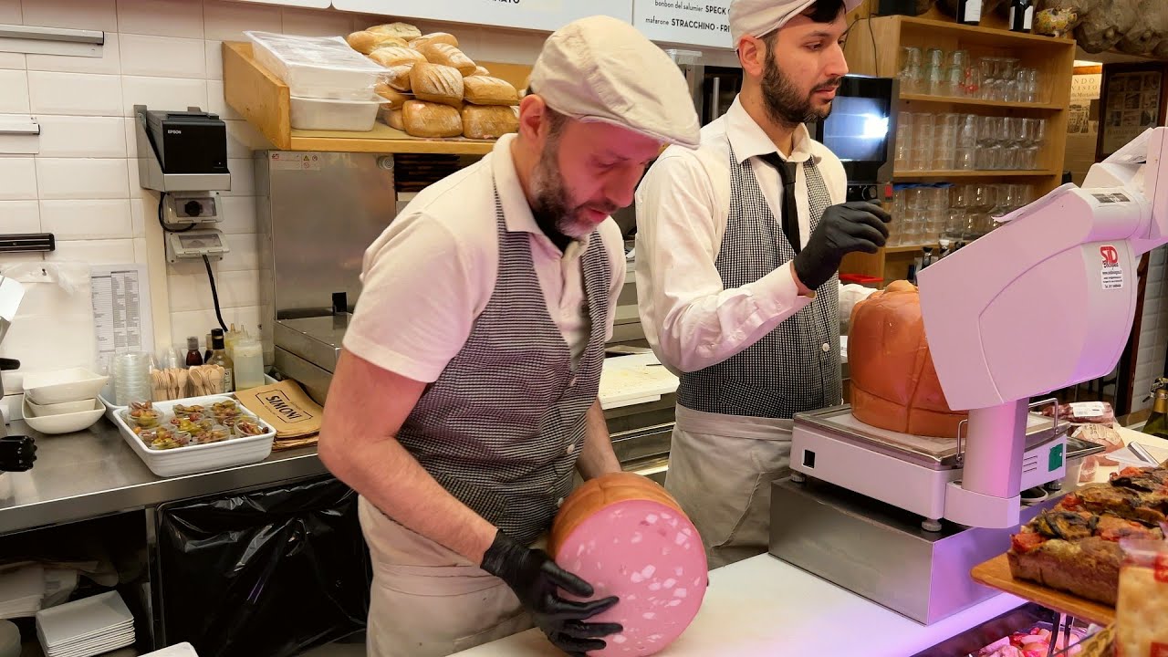 Today, Mortadella di Bologna IGP is made from high-quality pork, finely chopped, mixed with lard, lightly seasoned and finally packaged in huge sausage “loaves” and cooked.