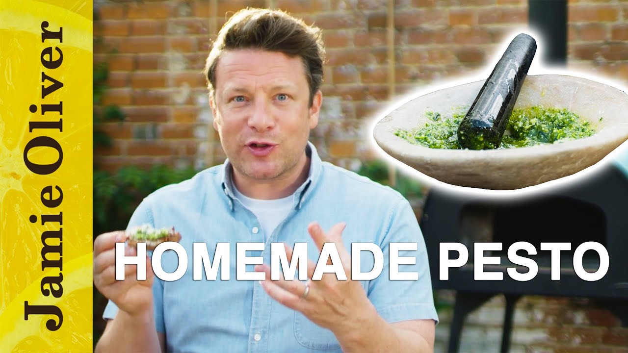 Jamies takes us through the principals of making pesto and shares the wisdoms passed onto him by the Italian Nonna he has met over the years. The traditional Genovese method uses garlic, basil, pine nut, olive oil and parmesan or pineapple but Jamie encourages us to do like the Italians and make it with what we have available. It's guarantied to be delicious.