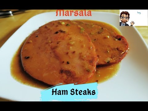 Add the remaining 2 TBS of olive oil and the flour. Cook and stir to make a roux. Cook until the roux smells toasted but is not colored, about a minute or two. Add the Marsala wine and 1/2 cup of water, and bring to a simmer. Place ham steaks in the sauce, and simmer to meld the flavors, about 5 minutes. Taste the sauce, add salt to taste.