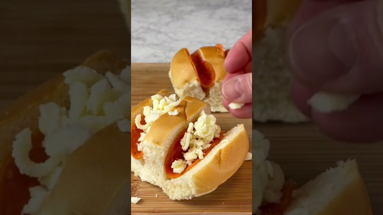 Make 2 cuts along the top of the buns. Stuff 2 pieces of pepperoni in each slit, along with a pinch of Mozzarella. Place the buns on a baking sheet lined with parchment paper.