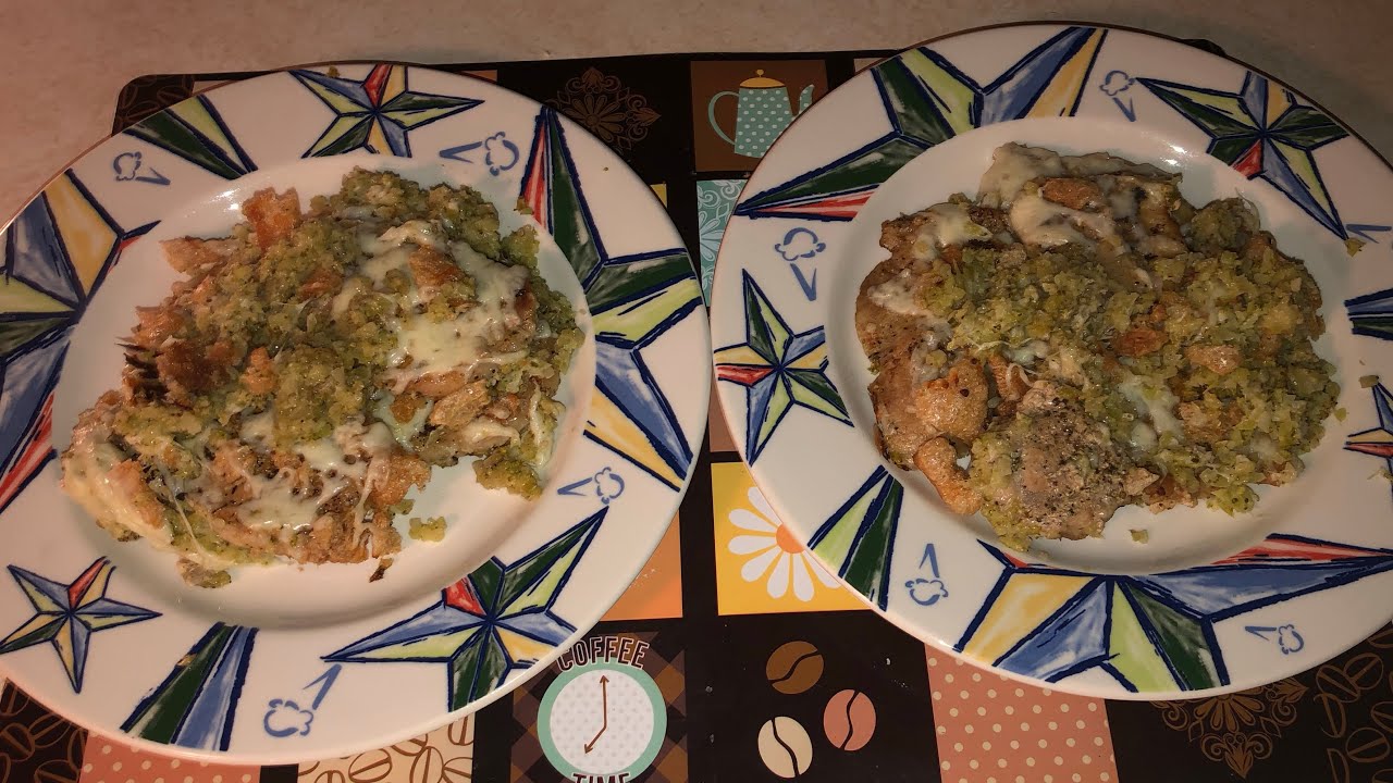 Start by preheating the oven on 400 then start cooking up your pork chops stove top with 4 tbsp of olive oil, heavily pink salt, light pepper, light Italian seasoning cover and cook on a medium heat, while that’s cooking heat up your riced broccoli in the microwave for 6 mins, when your pork chops are done on one side turn over and add more pink salt, light pepper, light Italian seasoning cover again and let finish cooking now take your cooked riced broccoli and add it to a cake pan with 1/2 cup of Alfredo sauce, mix well and spread out on the bottom of the cake pan and add over your cooked pork chops and hand crush up 1 servings of plain porkrinds then put into the oven for 20 mins after 20 mins add 1 cup of mozzarella cheese and bake again for 5 mins then take out and serve up!!!! 18 net carbs for the whole dish.