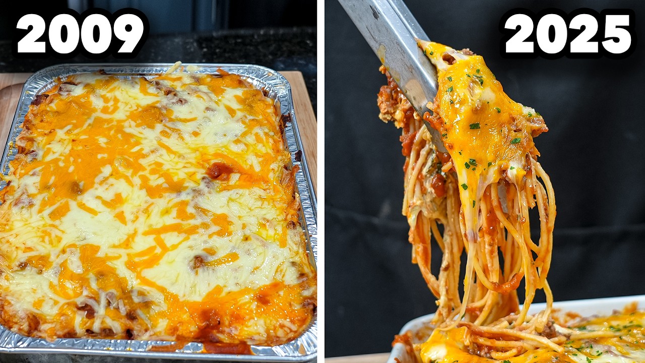 Today we’re back in the kitchen for another episode of our then versus now series where I show you guys how I used to make some of my most popular recipes back in the day versus how I would make it now. Today we got baked spaghetti on the menu. Meet me in the kitchen. Let’s make it happen. All right, guys. Back in the day when I was about 18 years old, I had my very first apartment and I lived off of baked spaghetti. We used to do two in a foil pan. I’ll make two foil pans worth and I would eat it all week. Wouldn’t recommend that now. All right. All right, the original recipe is super simple. We’re using what I used to use, which is Ragu spaghetti sauce. Not the best spaghetti sauce on the market. If you want to use something that’s a little bit more complex, a little bit more flavorful, I would go with something like Ryos. I also did a whole episode on all of the different pasta sauces at the grocery store. You can check that out if you want to. Today, we’re keeping it tried and true, though. OG Ragu is going to get the job done. We got Italian sausage. We got ground beef. We have cheddar, which is not at all authentic to spaghetti, but that’s what I used to use. Mozzarella, onion, bell pepper, and of course, the spaghetti pasta. You won’t buy the peppers pre-diced. Um, I I think no, because they’re more expensive pre-diced. All right, guys. So, after all the prep work is done, dicing the peppers, dicing the onions, grating your own cheese, it’s time to go ahead and actually start cooking. Now, back in the day, I never grated my own cheese. We did that today. Typically, that would have been pre-shredded from the store. We’re using 80/20 ground beef and some mild Italian sausage. This is optional. If you don’t eat pork, guys, you can go ahead and uh, you know, use turkey or just all ground beef is cool, too. Going to add a little bit of oil to our pan. One pound each of sausage and ground beef. I think back in the day I used to use the links more often, but this is what they had at the store today. This is what we’re going with. Going to get this in here, cook it, add in the peppers and the onions, and then basically build our pasta sauce, courtesy of [Music] ragu. All right, as the uh meat is cooking, we’re going to go ahead and season it up some. We got about a tablespoon or so of Italian seasoning. Use my allpurpose, which was still in the R&D phase back then. Salt, pepper, garlic, onion powder, things of that nature. Back in the day, I kind of just used whatever we had. A lot of onion powder, a lot of garlic, salt, pepper, you know, the basics. Little extra salt cuz my AP is low sodium. And then we’re going to get in there and just give this a good mix. Break it up. I don’t think I really was dicing much fresh garlic back in the day. And this was before they had the garlic paste that I use now. So, garlic powder was my go-to. Going to give this a mix. And we’re going to add in our rag goo. [Music] good to the last drop. And then you can clean this out. Use it as a cup. Never did that. That’s good cup size for back in the day right there. Give it a mix. Let this simmer. Add a little sugar. Season to taste. Good to go. All right, guys. So, we’re going to add a little sugar, which in hindsight is absolutely ridiculous when it comes to ragu cuz it’s already sweet. Uh, but we’re going to add some cuz that’s what I used to do. And then you guys know what this is. Green top parmesan. Going to add a little bit of that to our sauce and then save the rest to add to our plate of pasta. Turn the heat down a bit. Mix in that parm. Going to add a little saltiness from the parmesan. It’s going to be good. Don’t get your blood work done after this, but it’s going to be good. All right, so once the pasta sauce is done, we’re going to add the spaghetti, mix it together, put it in the foil pan, top it with cheese, pop it in the oven at 350 for about 20 minutes until that cheese melts and everything comes together, and you got lunch for a week. All right, so one of the techniques that I’ve learned along the way is when you’re browning ground meat in particular, you want to develop some crust. It’s going to add color, flavor, texture, all that good stuff to your recipe. So, it’s very important to get a good sear on your meat. I’m going to add a pinch of salt in here just to get the party started with the seasonings. We got some Italian seasoning. I got my buttery garlic pepper seasoning, that AP seasoning. Going to add a little garlic. Got plenty of flavor coming in our bors and garlic and herb cheese blend that we’re going to put together. This is going to be a much more elevated version of the original. There’s still hints of, you know, what I learned when I very first started making this that are made it in into this recipe, but for the most part, this is just a more refined version uh of me making baked spaghetti for years and years. So, this is what you want to see here. You got some nice color and crust developing. Again, that’s going to add texture, color, flavor. Very important. All right, guys. So, the difference between store-bought sauce, something like ragu especially, and making your own tomato sauce is pretty significant. Like, for example, in the ragu sauce, there’s no real tomato in the actual sauce. If you read the ingredients list, it’s tomato puree and water, which kind of makes the sauce. For us, we’re going to use actual San Marzano tomatoes, which they’re naturally sweet. They’re better for you from a health perspective, and they’re more flavorful. They’re more robust. Again, naturally sweet, a little bit acidic. It’s going to be a lot better in a as far as the flavor profile goes. You want to add All right. So, we’re going in with a tablespoon or two of good quality tomato paste. That’s going to add some concentrated tomato flavor. And if you’re using ragu, they would just add water to to t