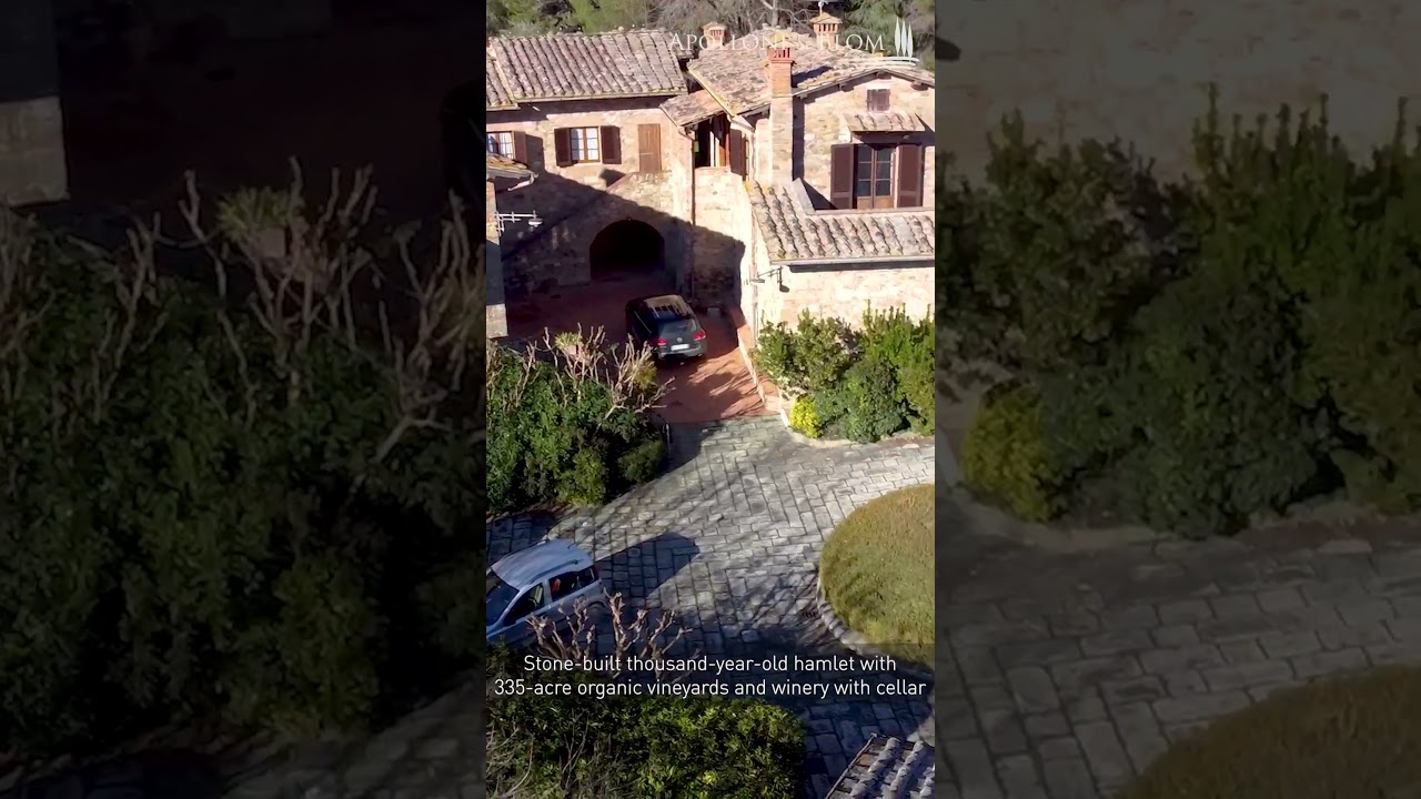 Stone-built thousand-year-old hamlet with 335-acre organic wine farm and winery with cellar for sale in Castellina in Chianti, Siena.
