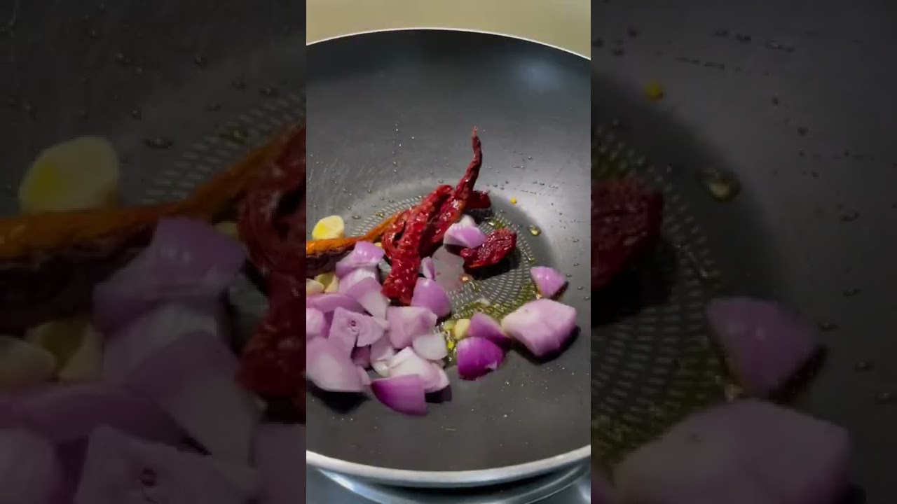 – In little oil fry dried red chillies, garlic, onion and cook till it turns golden brown and the raw flavour has gone.