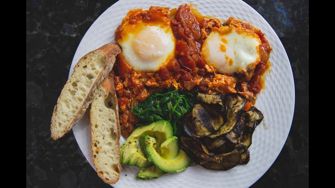 Prepare the plates with eggs and tomatoes, eggplant salad, spinach, avocados and bread.