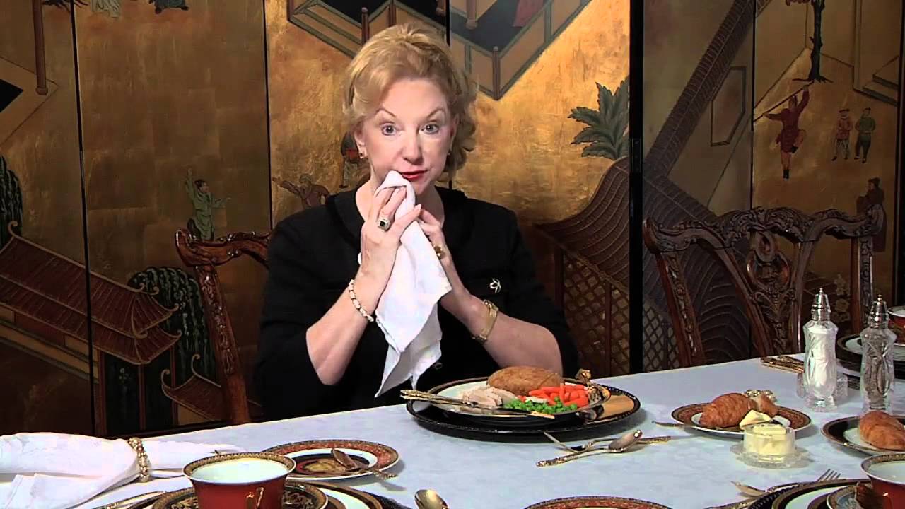Then prior to having a sip of your beverage, you would use your napkin or speak to your other guests. Then pick up your cutlery, again, upside down, cut, move forward and eat. When you have finished your entree, then the cutlery would be placed together like this, indicating to the wait staff that you are finished. If you are a slow eater, you want to speed up a little bit and if you are a fast eater, you need to slow down so that all of the guests are finished approximately at the same time. Another key point is the hands must always be seen. So an easy rule is, always, sometimes and never. No elbows on the table. The old rule was the hands were only seen when you are actually eating and the rest of the time, they are on your lap. That is obsolete and inappropriate in today’s global society. So it is always, sometimes and never.
