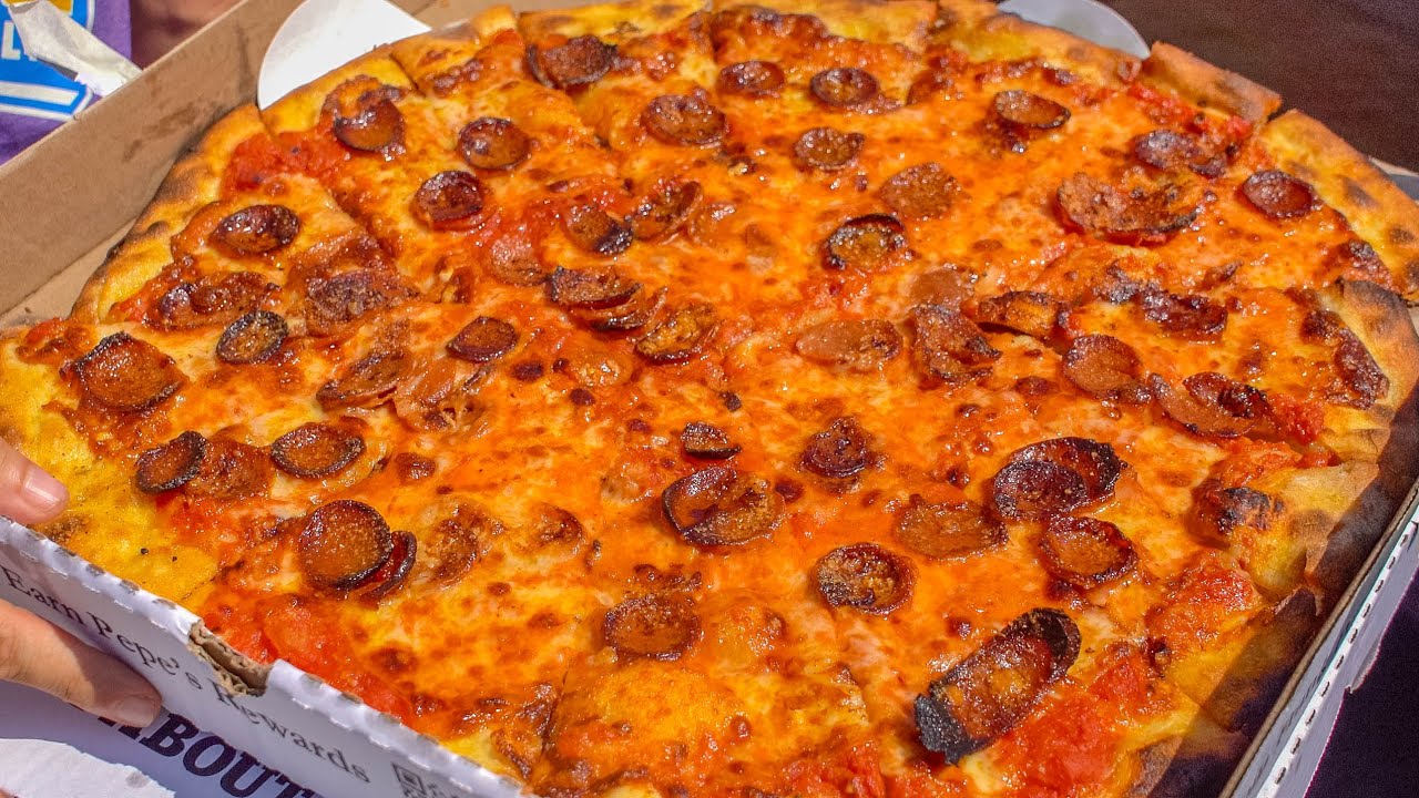 Love the looks of this one. Excellent peps, nice greasy color, beautiful crunch. Thin and floppy. Surprising amount of chew pull to get a bite. Lovely pie all the way around and I would definitely eat this and enjoy it. An 18" single topping for $33.55USD ($46.34CAD) is expensive! However, the more people that you can feed from it the better bargain it becomes. I score this an 8.6.