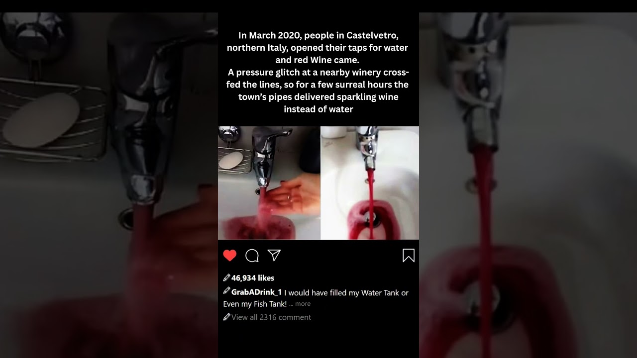 An amazing fact, In March 2020, people in Castelvetro, northern Italy, opened their taps for water—and red Wine came, a true story. Real story drama came when a pressure glitch at a nearby winery cross-fed the lines, so for a few surreal hours the town’s pipes delivered sparkling wine instead of water. Such amazing story