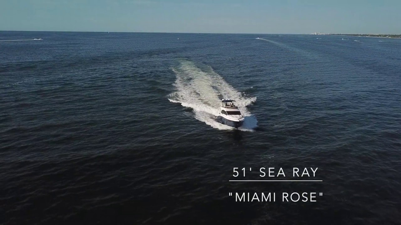 This 2017 Sea Ray 510 Flybridge, Miami Rose, has low hours, and is in excellent condition. Introduced in 2015, the Sea Ray 510 Fly joins the L650 Fly in Sea Rays growing fleet of new-age motor yachts. With her sleek lines and distinctive hull windows, the Fly looks much like a purebred European yacht. (Take away the Sea Ray badge and most would think she was built in Italy.) Entering through triple-pane sliding glass doors, the salon offers facing leather sofas, a fixed dining table to starboard, solid hardwood flooring, and an entertainment center in the starboard corner. The 510’s large galley is up two steps from the salon, and the lower helm station to starboard features a single Stidd captain’s chair and opening side window. There are three staterooms and two heads below including a full beam master with hull windows and two-person dinette, and a spacious VIP stateroom forward with private access to the day head and shower. The cockpit has an L-shaped lounge to port (with crew quarters entry under) and an electric grill opposite, tucked under the bridge stairs. Topside, the flybridge is huge for a boat this size. Upgraded Cummins 600HP Zeus pod drives.