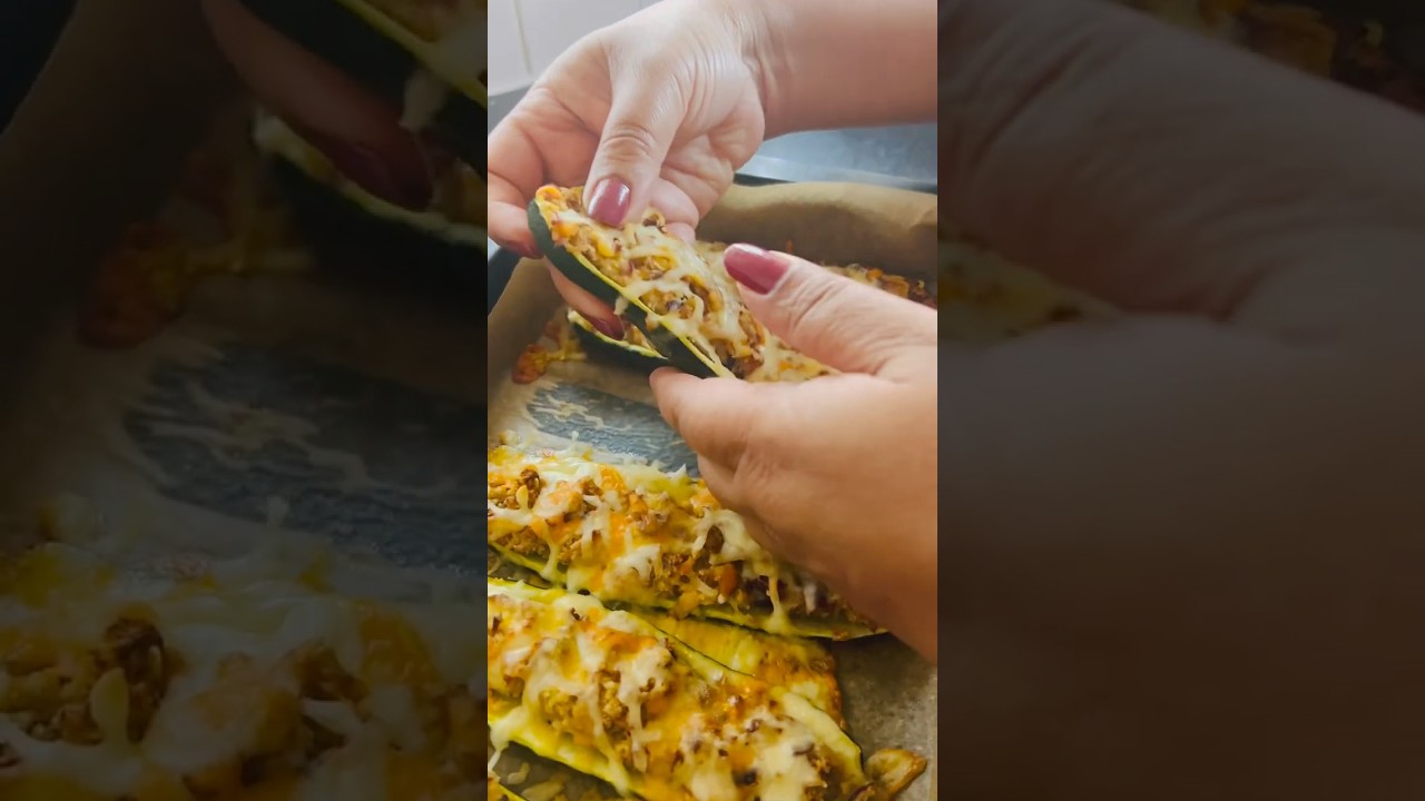 In this recipe, I cut the zucchini in half, scoop out the inside, and chop it together with onion, breadcrumbs, chives, salt, tuna chunks, and olive oil. Then I fill the zucchini shells, bake them, and finish with a layer of melted cheese.