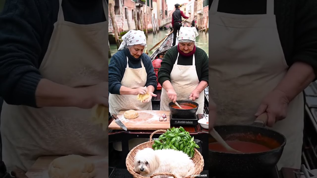 Description: Italian grandmas and their dog make homemade pasta on a canal boat — love, laughter, and flavor of Italy.