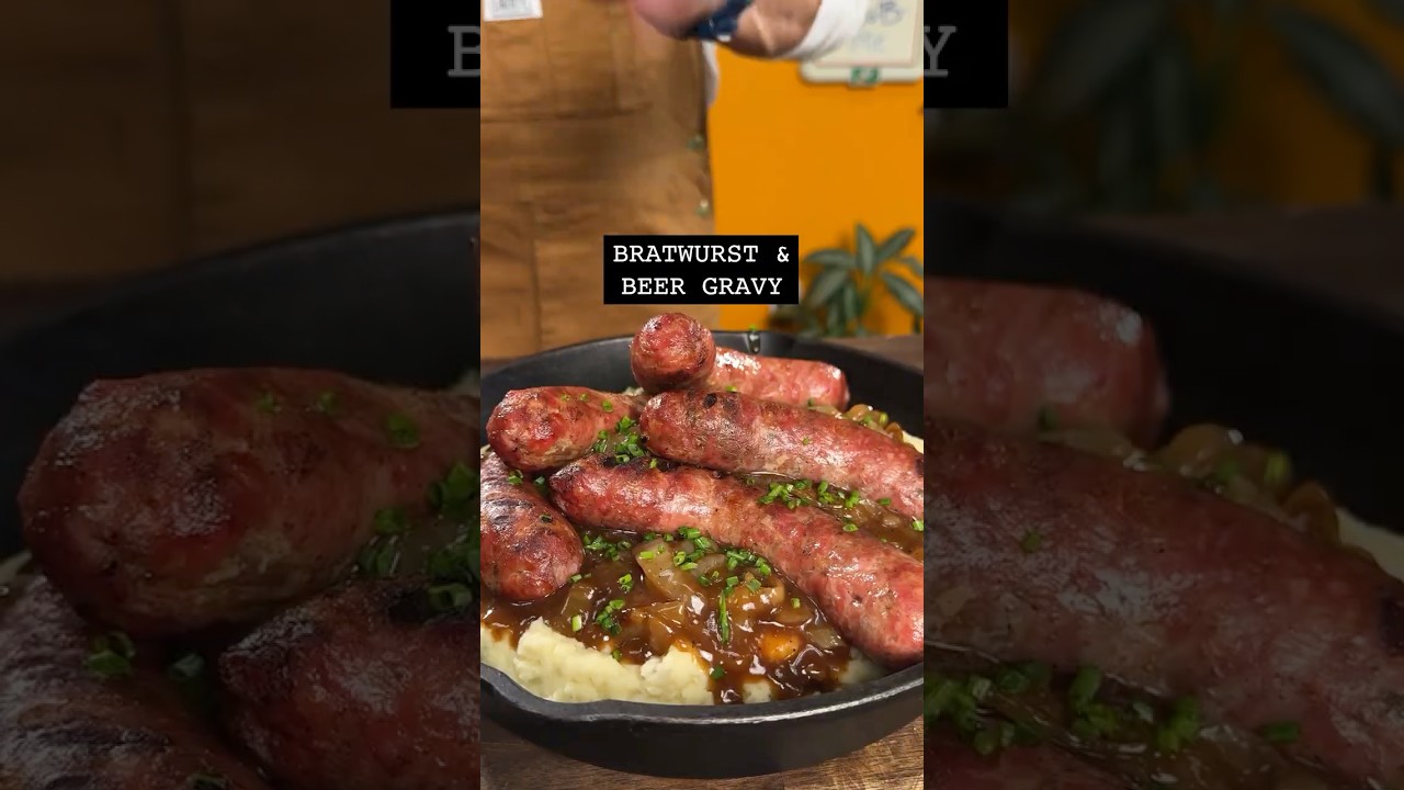 Fresh bratwurst 1 Tbsp olive oil 1 yellow onion, chopped Onion Butter seasoning 1 Big Sunday Brown gravy packet 1 beer, we used @shinerbeer