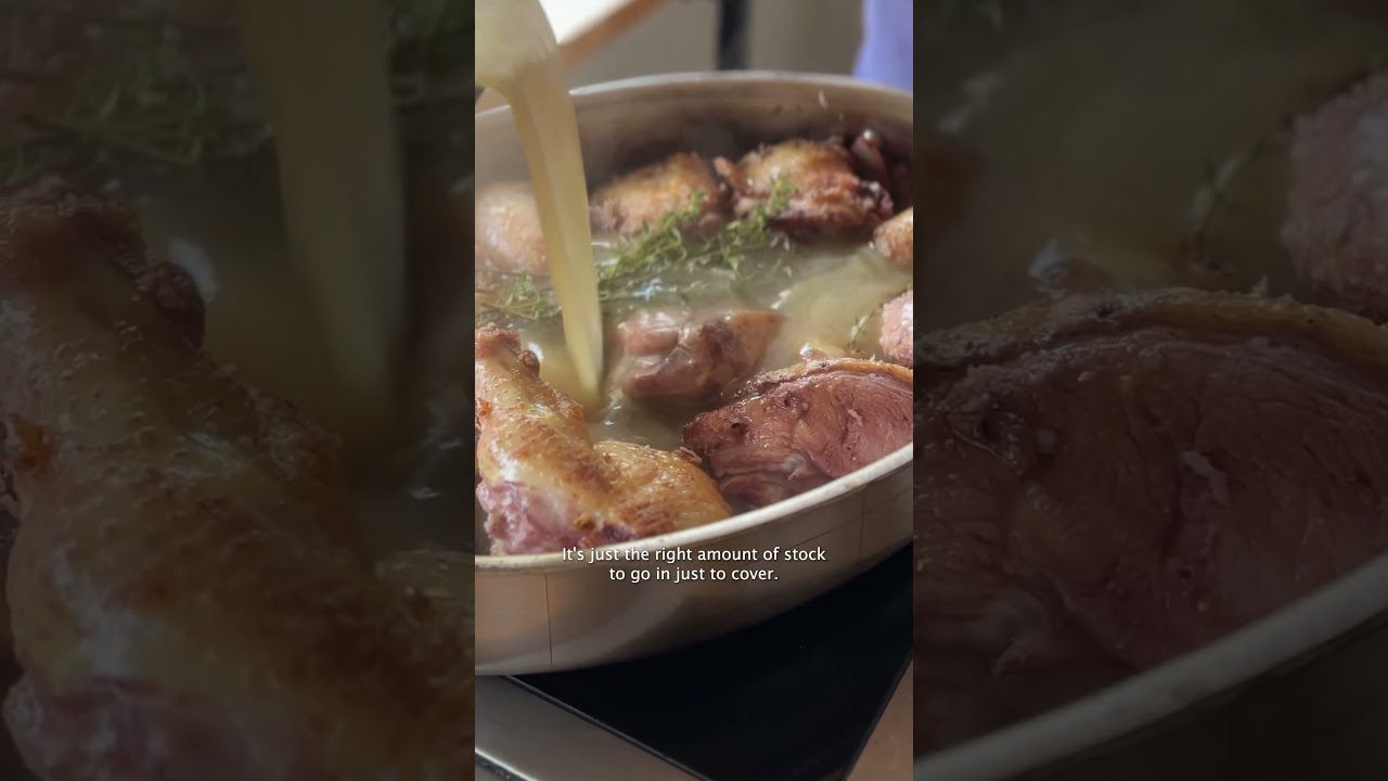 Yeah I like caramelizing the pearl onions in with your bacon… I like to sear my chicken pcs before braising and I pull the skin off, render it for the fat and that's what I sear my chicken in… I pull my chicken, caramelize my julienned onion and carrots, then put my chicken back in, my spices and then my wine… I've been playing around with dry vermouth lately instead of a Cabernet sauvignon