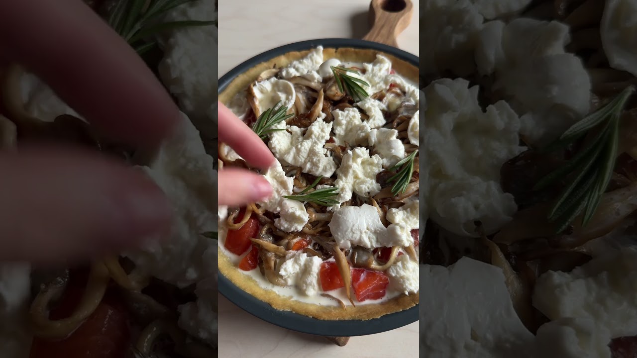 (base): wheat flour 150 g butter (cold) 75 g egg yolk 1 pc ice water 2-3 tbsp salt 1/2 tsp For the filling: trout fillet (fresh or lightly salted) 200-250 g oyster mushrooms 200 g shallots 3-4 pcs mozzarella cheese 150 g salt, freshly ground black pepper pine nuts rosemary For the filling: eggs 3 pcs cream 20-33% 200 ml salt, nutmeg
