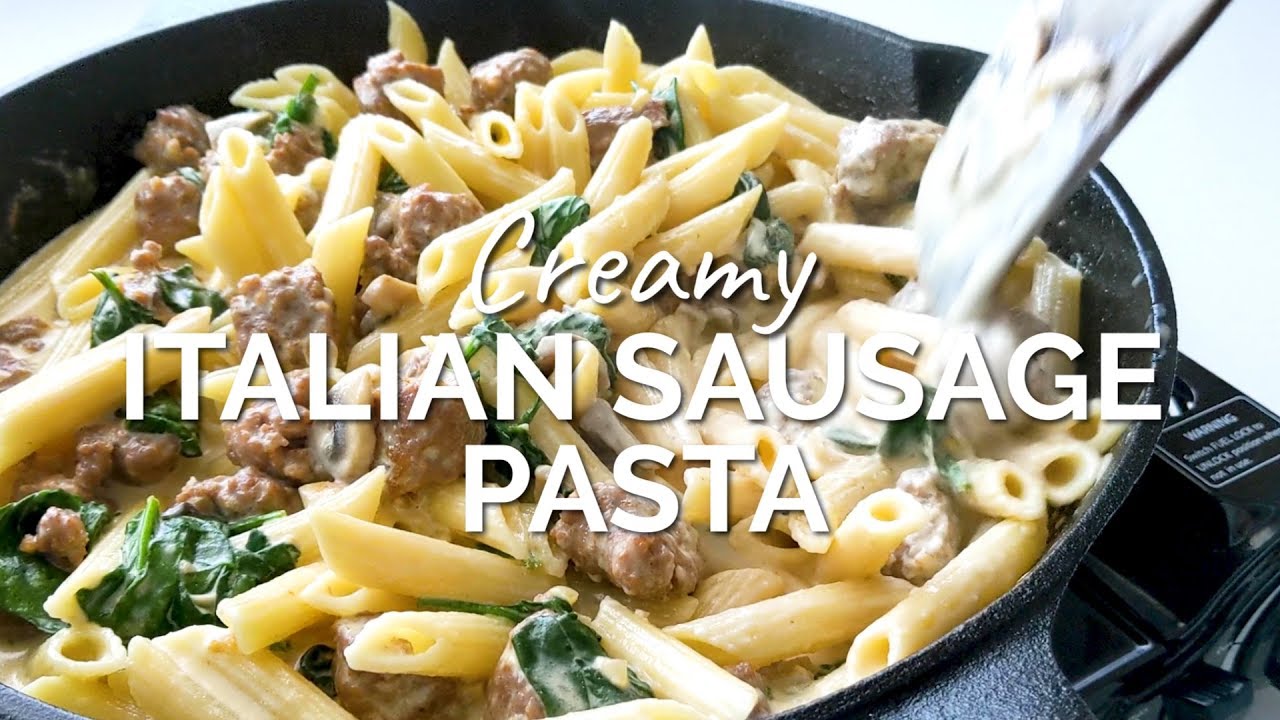 This parmesan cheese loaded Creamy Italian Sausage Pasta is our go-to quick and tasty weeknight meal. Packed with mushroom, baby spinach and Italian sausage of course!