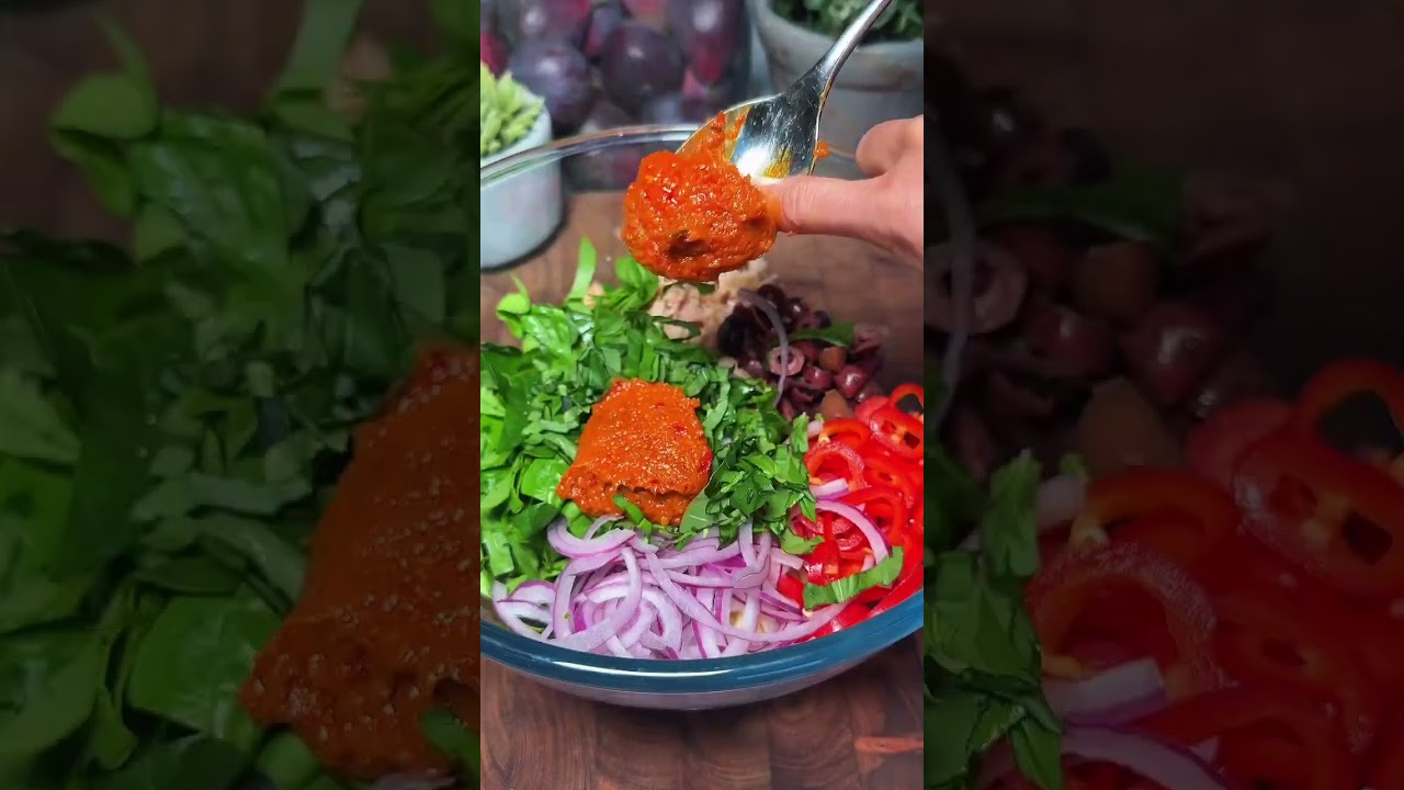Thinly slice the onion, dice the basil and shred the spinach. Slice the red pepper and roughly chop the olives. Mix everything together with the pesto, add the amount to your liking, a squeeze of lemon and good amount of salt and pepper.