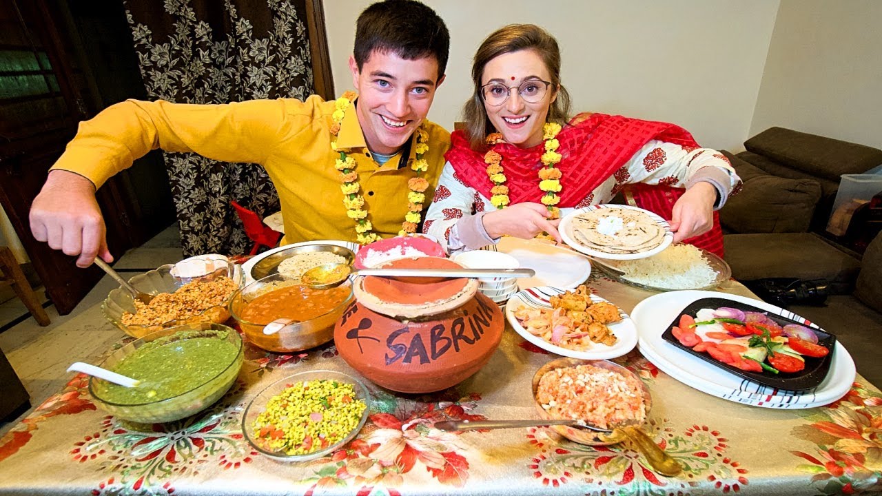 In today’s episode, we went to Gaurav’s family home in Delhi to experience a true Indian family meal. We were greeted by Gaurav’s mother and wife who are the head chefs of the home. Before preparing the dinner, we sat down to enjoy homemade chai and gobi parathas (cauliflower) with pickles. We also dressed in traditional Indian clothing (Indian tunic and shawl for Sabrina, and a kurta for Luke) with a flower garland for the special occasion. After our snack, it was time to start cooking in the kitchen. With fresh ingredients from the local market, they made: rajma (red kidney beans with rice), dhal (made from lentils), bean sprout salad, chicken tikka (marinated chicken grilled on skewers), lump cabbage salad, chicken curry, green chutney, chapati (Indian flatbread), carrot halwa (sweet dessert) and they even hand painted this claypot for our visit! It was incredible to watch these women cook these Indian dishes and they even explained how every ingredient was used!