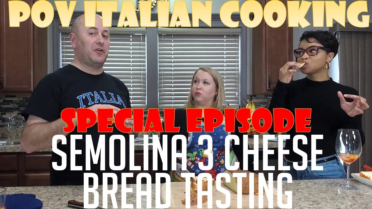 In this video, I’m joined by my wife’s team from work in the POV Italian Cooking kitchen and we try my Semolina Three Cheese Bread. I made this as one of the appetizers to keep us going during a long day of filming. You can see how to make this bread in episode 86 of POV Italian Cooking!