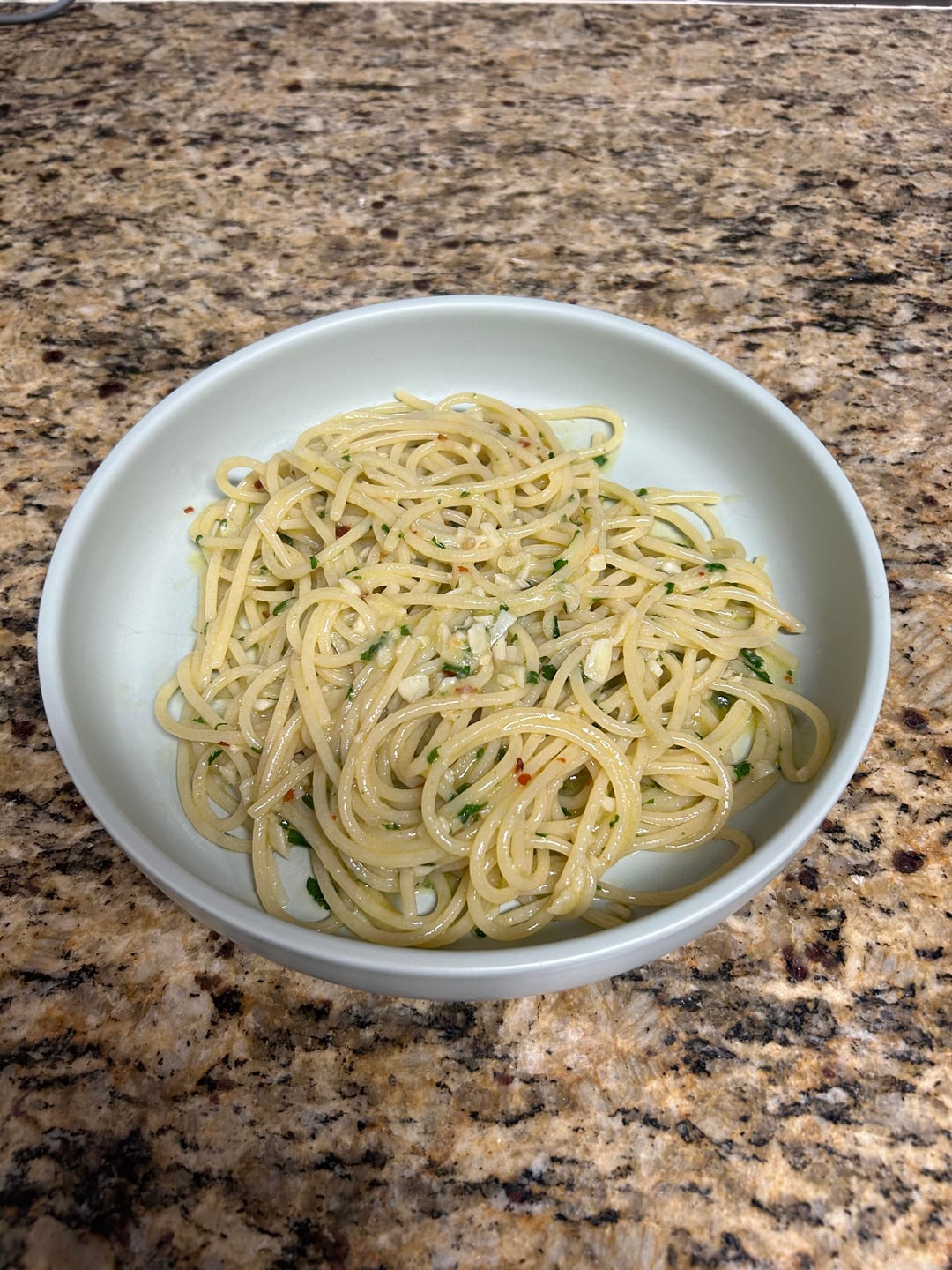 Ingredients: Spaghetti, chopped parsley, garlic, extra virgin olive oil, pepper flakes, salt