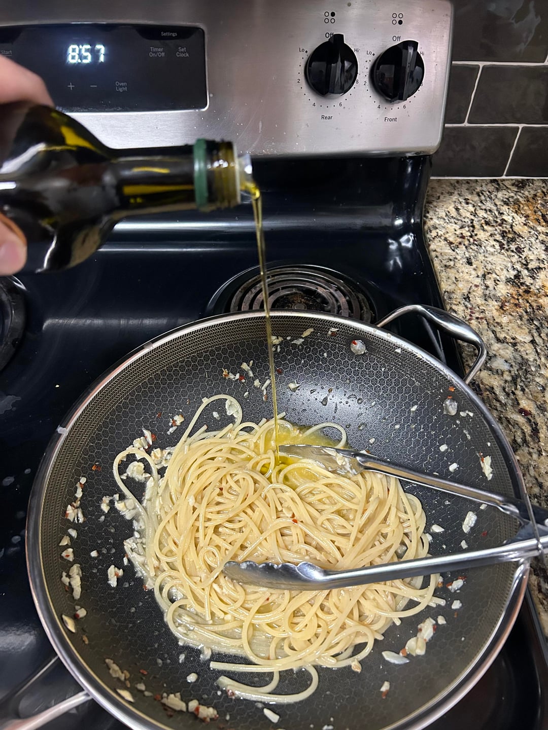 Used to doing this with a real chili pepper, but I only had pepper flakes available. Turns out it was very easy to add too much. It got spicy.. One clove of garlic and two table spoons of extra virgin olive oil was enough for a meal just for myself.
