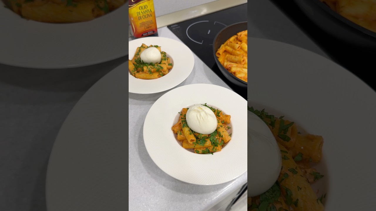 Ингредиенты: Макароны «Tortiglioni» – 400 гр. Лук – 1 шт. Чеснок – 1 зубчик Томатная паста – 3 ст.л. Вода из под макарон – 1 половник Сливки 20% – 150 мл. Соль и специи по вкусу Сыр «Буррата» – 2 шт. Петрушка для подачи