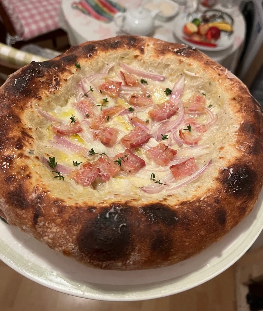 White sauce is just a garlic thyme infused bechamel with some nutmeg. Pancetta and Shallots on top.