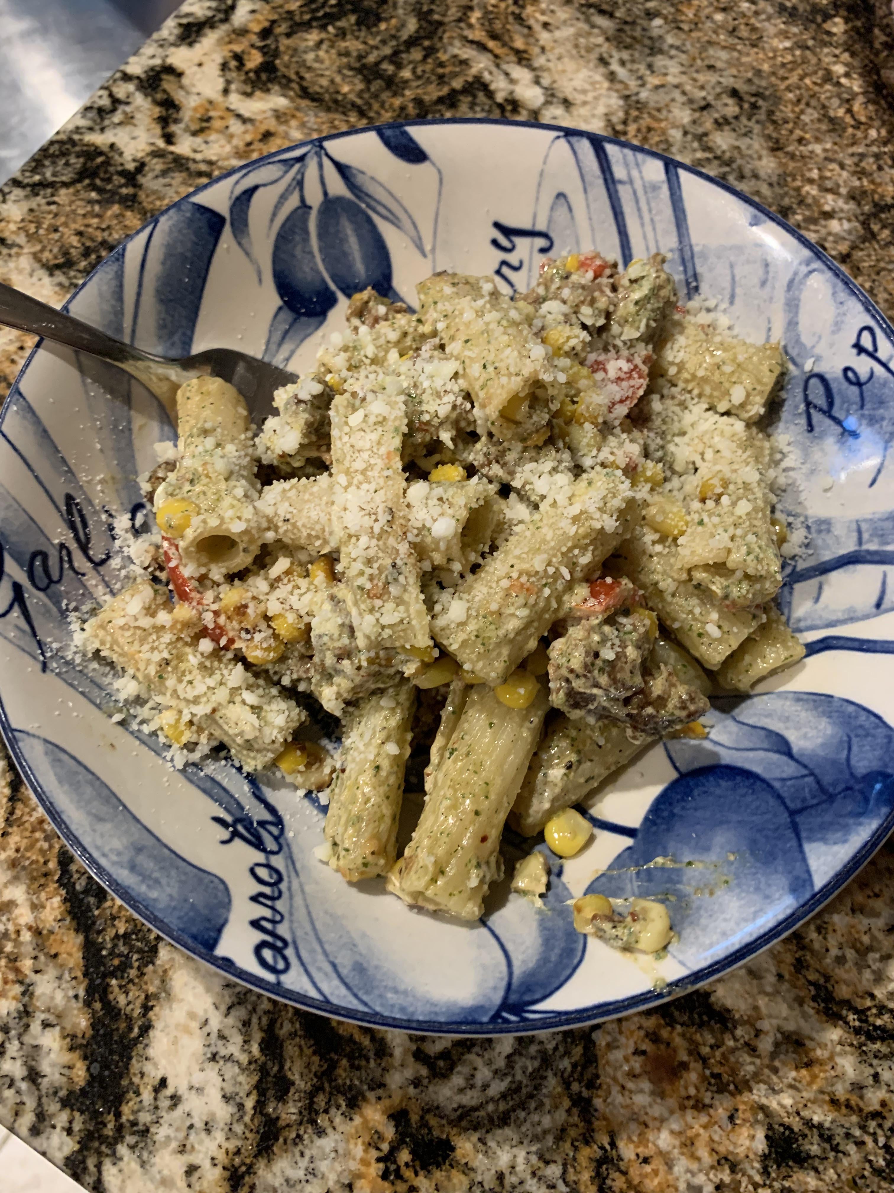 Pan roasted corn and red bell peppers, then added pesto sauce. Added al dente pasta and finished with Parmesan.by dentalexaminer Homemade DishPastaWrite A CommentYou must be logged in to post a comment.