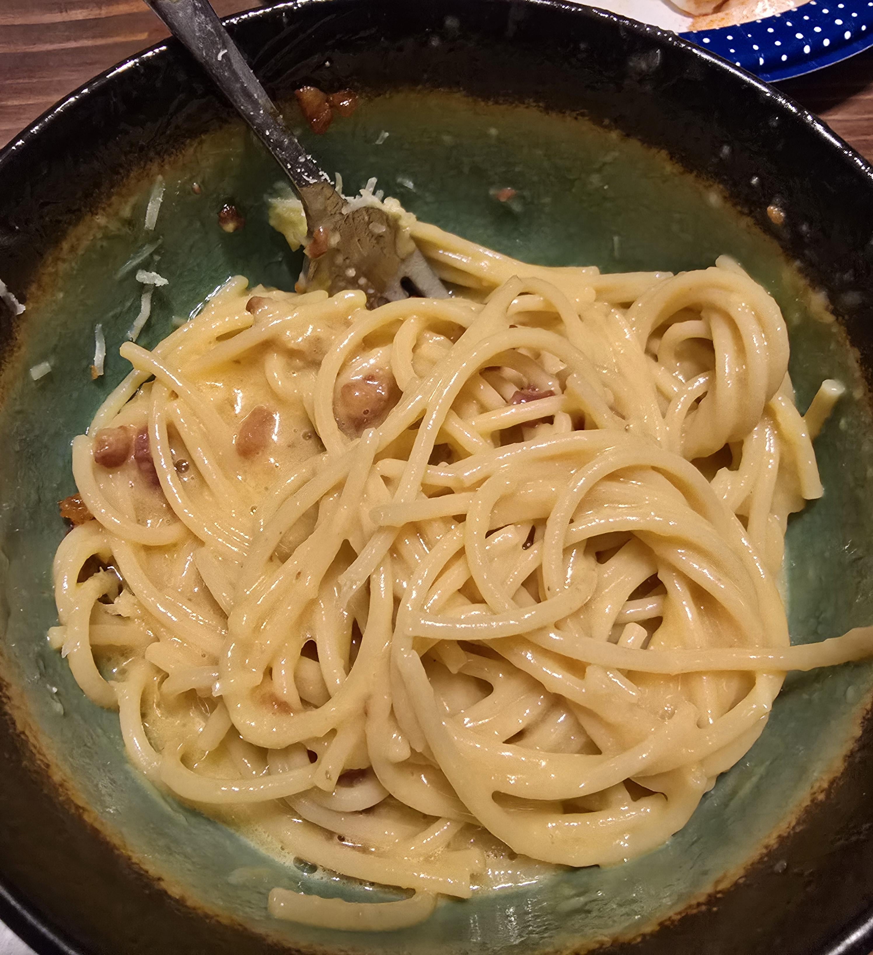 it's a running joke that I always forget some kind of ingredient, and yesterday was no exception. I had toasted up some peppercorns, and ground them up with my pestle and mortar to top the carbonara, and of course forgot to put it on before serving ๐ซ