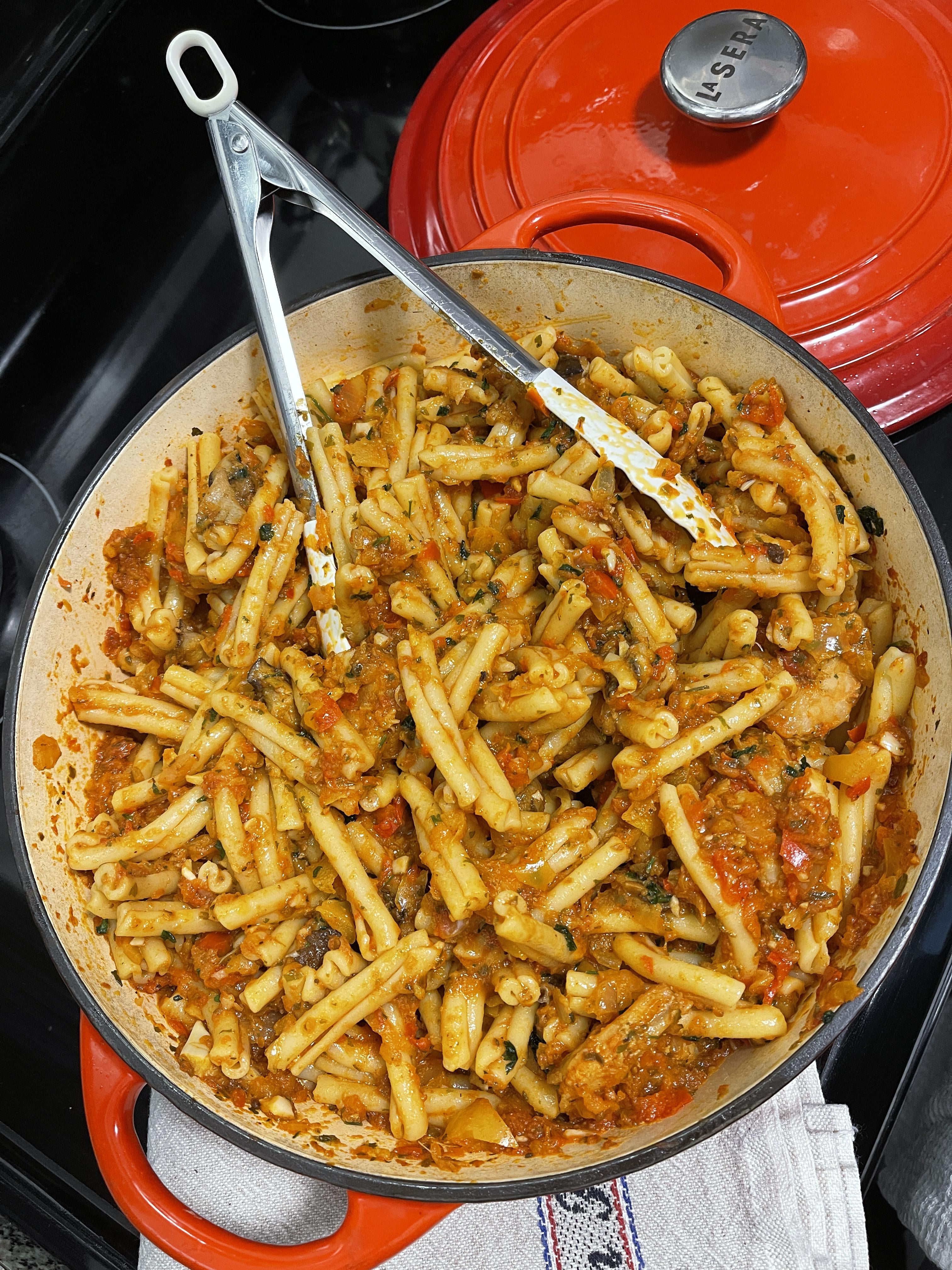 A one-pot pasta cooked directly in a homemade vegetable tomato sauce. The pasta finishes in the sauce, absorbing the flavors as it cooks, with olive oil, vegetables, and tomatoes doing all the work. Simple, home cooking meant to be eaten fresh.