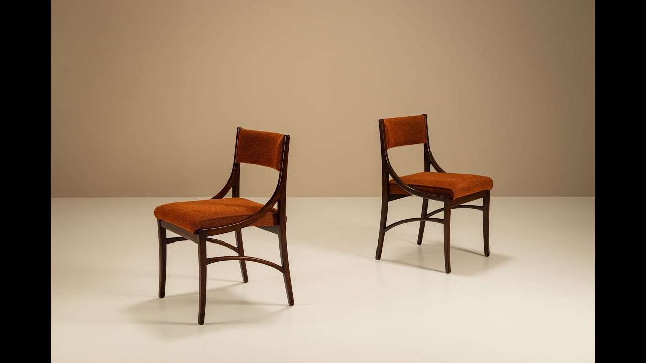 Each chair features a dark-stained solid teak frame, whose sweeping curves and subtle detailing speak to Parisi’s sense of balance and lightness. The sharply defined arc of the front stretcher adds tension to the silhouette, while the sculptural backrest supports create a fluid transition between seat and back. These architectural elements are tempered by comfort: the gently angled backrest and deep seat provide support without compromising the slender profile. The chairs have recently been reupholstered in a burnt orange fabric, which complements the warm tones of the wood and underscores the mid-century Italian aesthetic. Designed during a period when Parisi was refining his modernist language, the Model 110 blends rational construction with a soft, almost lyrical rhythm.This pair presents an opportunity to acquire original examples of Parisi’s work in a condition that reflects both their enduring design and thoughtful restoration.