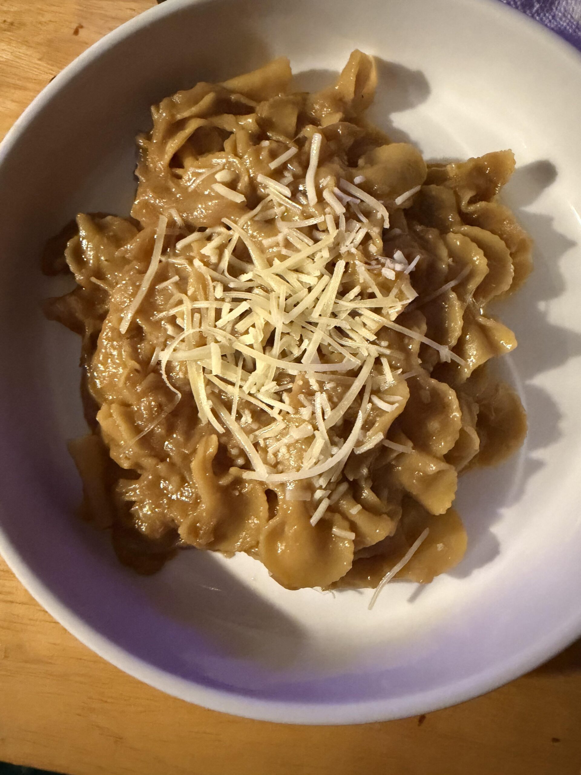 – Caramelized 6 large sweet onions for about 1.5-2 hours – Added a little less than a pound of farfalle and enough beef broth to cover, along with worcestershire, a head of roasted garlic, and a bit of thyme – Simmered until the pasta was al dente and the beef broth mostly evaporated – Mixed in some parmesan cheese – Served topped with a bit more parmesan