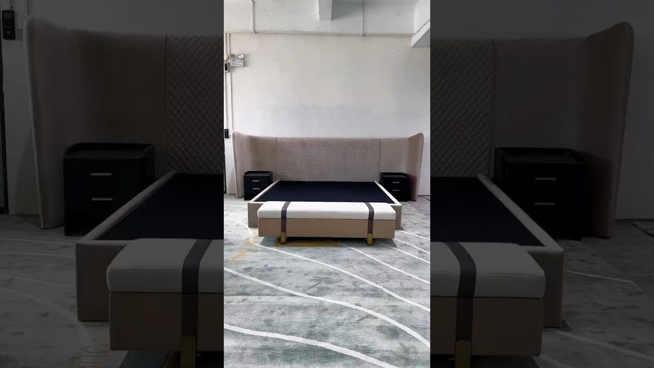 Crafted with premium upholstered materials and a refined geometric headboard, this bed brings Italian light-luxury elegance into any master bedroom or high-end villa.
