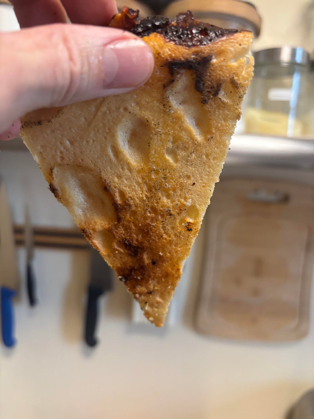Nice crispy edges. Not a ton of flavor in the dough. Had to remove it from the pan to finish the bottom on the stone. Solid 6/10. 7/10 if I had a fountain coke in a big red plastic cup.