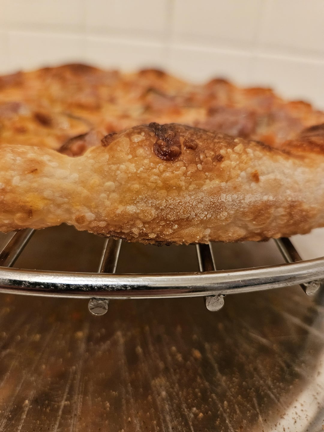 It really was an entirely new pizza for us last night. Starting with the dough, I tried my hand at a biga recipe this time. 14 hour biga followed by 72 hour stint in the fridge. Room temp for ~3 hours before the bake.