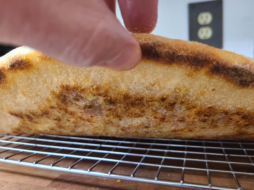 4 minutes max temp bake + 3 minutes high broil = 7 minutes total bake time. I had to go a little longer this time because of all of that bell pepper.