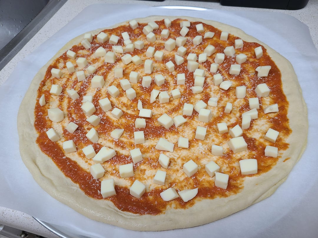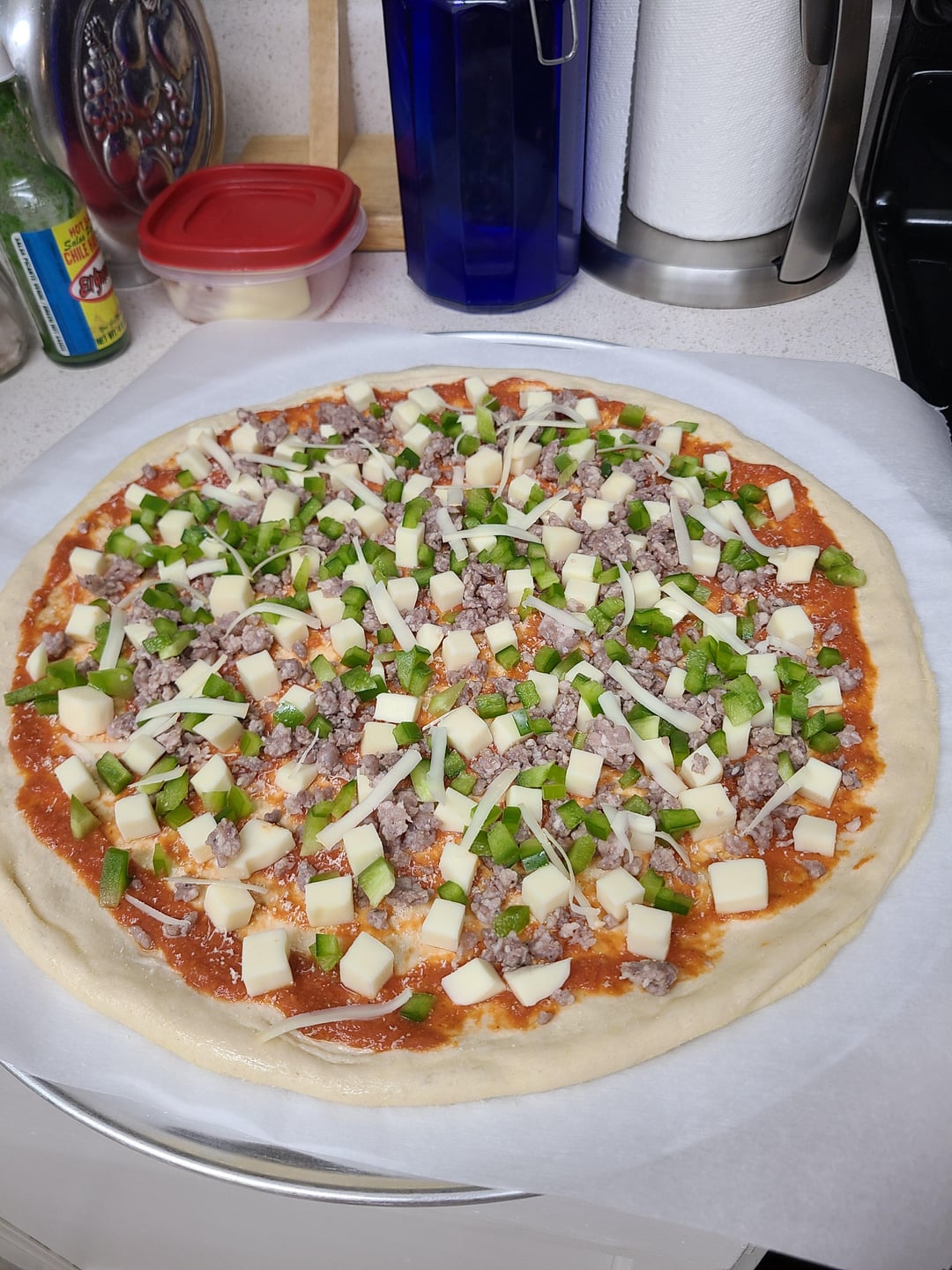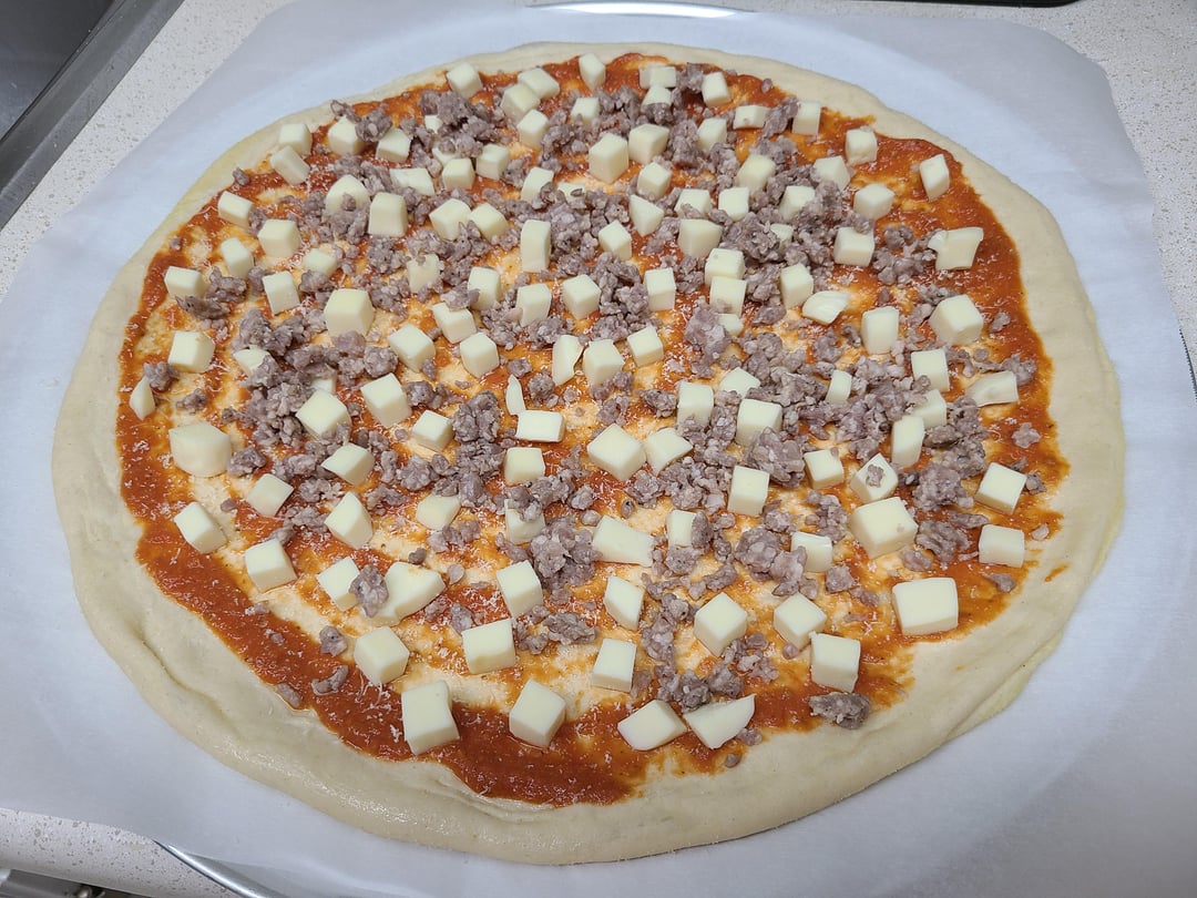 This week, I've been craving something simpler. A sausage and peppers pizza. Nothing fancy. Sweet Italian sausage, diced green pepper, (my own) tomato sauce, fresh grated Parmesan, cubed mozzarella and fresh shredded applewood smoked gruyere.