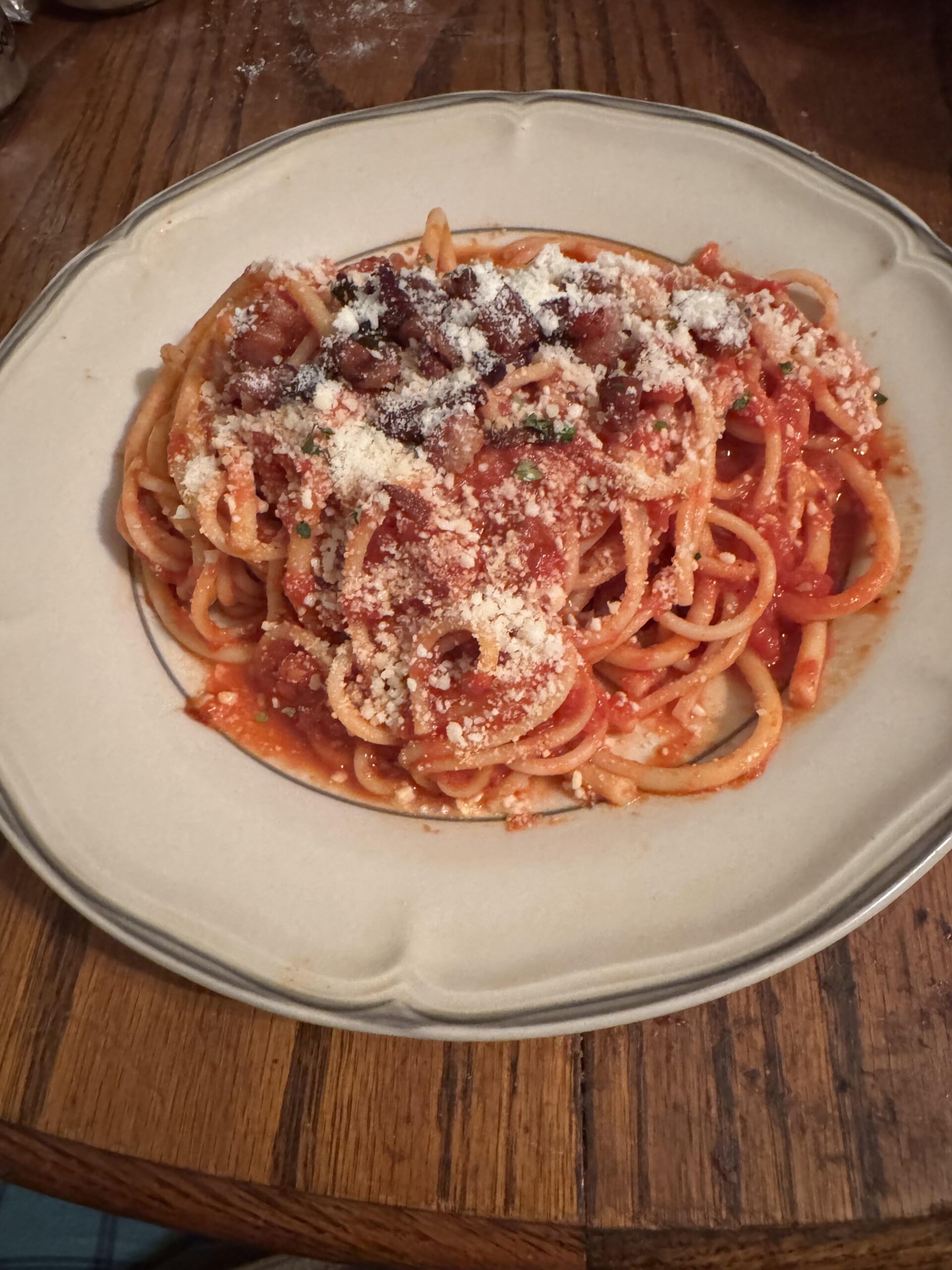 Last time I posted yall complained it was a small portion so here you go. Half bucatini half spaghetti cause I had left over pasta.