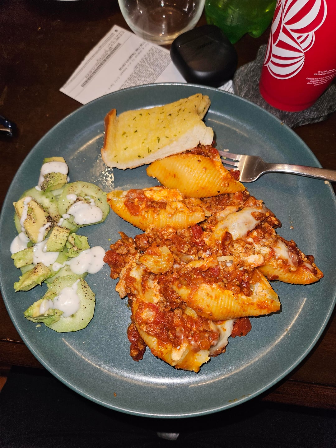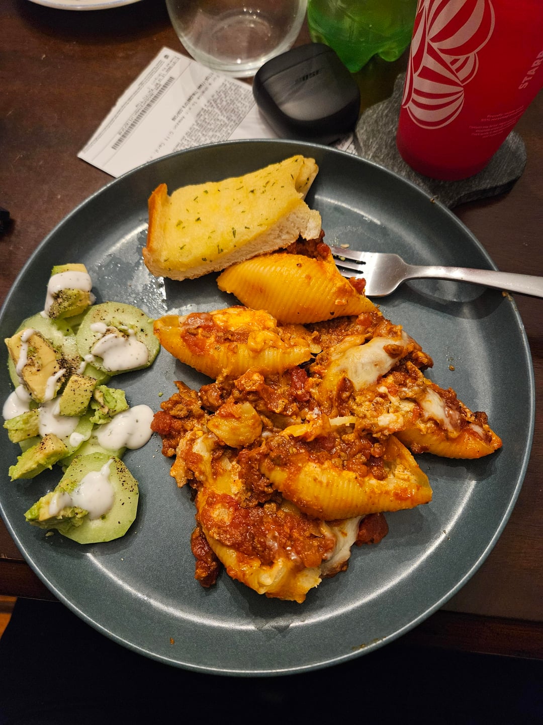 Cooked shells for 7 min then made a garlic basil sauce with ground beef. Stuffed the shells with a 3 cheese blend of parm, mozzarella, ricotta, egg, seasoning, and mixed in a little lemon zest. Topped the shells with the ragu and xtra cheese and baked for 45 min 😋 so good!!