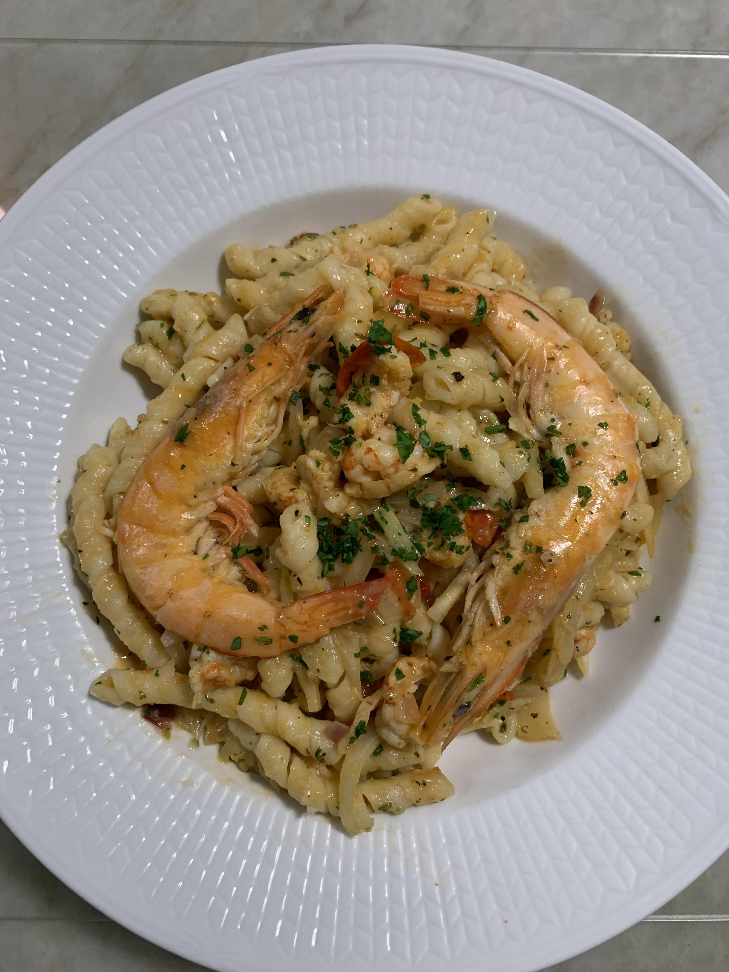 Incorporated some ingredients I brought back from Sicily – Busiate tossed in white wine, lemon and garlic, along with sautéed fennel, cherry tomatoes, langoustine tails, and prawns. The base is shrimp stock, finished with Sicilian olive oil.