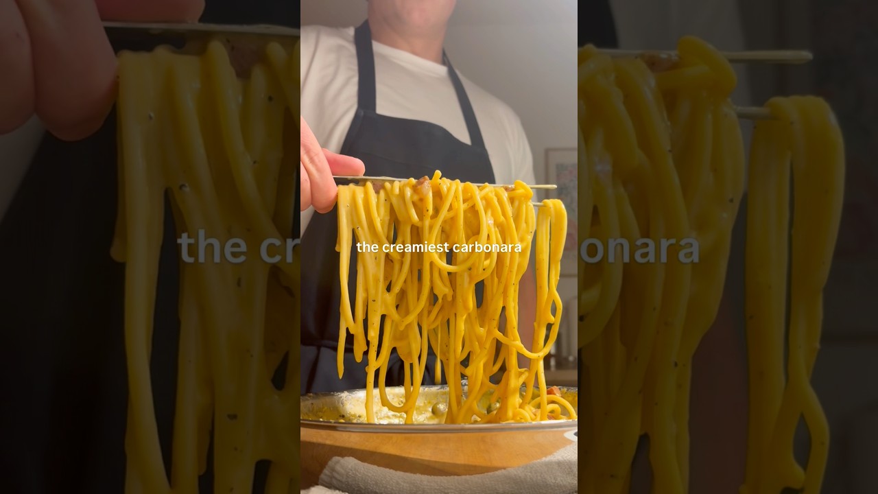 1. Bring a large pot of water to a boil, but only fill the pot 1/4 of the way – just enough to fit and submerge your pasta water while cooking. Don’t season your pasta water with salt, because every other component of your sauce is already well seasoned (pecorino, guanciale etc.). 2. Crack 4 of your eggs into a bowl. Then add just the yolks from your other 2 eggs. Whisk your eggs together until homogenous. Using a microplane, add a generous grating of pecorino Romano cheese, ~50g. Also add a generous grating of coarsely cracked pepper (bonus points if you toast your peppercorns beforehand!). Whisk your egg mix until everything is well combined. Set to the side. 3. Cut your guanciale into approx. 1cm dice. I like to keep my guanciale relatively large, because I like slightly larger, chewier chunks in my carbonara. It will also shrink a lot while cooking. Add your guanciale to a large, cold, heavy-bottom pan. Place the pan over medium heat, and cook the guanciale until it releases all of its fat + becomes nicely browned (see video for reference). Once you reach this point, remove your pan from the heat AND LET IT COOL DOWN. This is the most important step. You want your pan to be only slightly warm to the touch to prevent your eggs from scrambling in the next step. 4. As soon as you remove your guanciale from the heat, you can drop your pasta into the water and cook it as per package instructions. When it is nicely al dente, add it directly into your guanciale pan, bringing some excess starchy pasta water with it (roughly 1/3-1/2 cup in total). At this point, while your pasta is still warm, add your egg mix to the pan, and turn the heat on medium-low. Toss everything to combine, and continue stirring/tossing the pasta over the heat until the sauce thickens and can coat your pasta noodles without pooling in the pan. A good way to check when your sauce is done is to allow the sauce to collect in one corner of the pan, and to check it with a thermometer. You are looking for ~55 degrees C to remove your carbonara from the heat, where it will carry over to a perfect 60 degrees C while you plate. Plate up your pasta and enjoy! Be sure to spoon over plenty of excess sauce and guanciale. Top with one last grating of pecorino and a crack of black pepper. Enjoy!