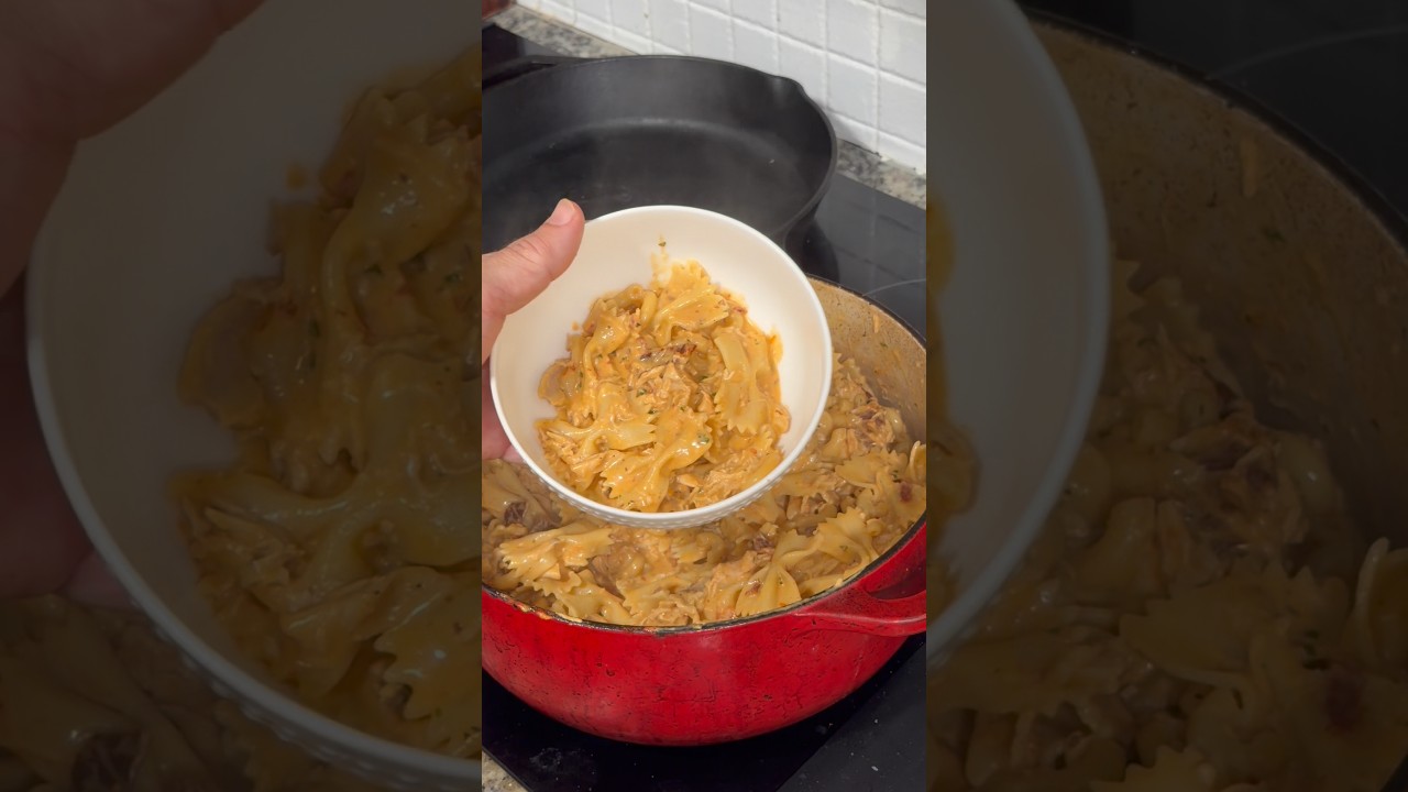 6. Prior to draining the pasta, reserve some of the hot pasta water. Add the drained pasta to the skillet and toss until coated. If needed, pour in a splash of the hot pasta water to the sauce to thin it out a bit. Serve immediately with more parmesan if desired.