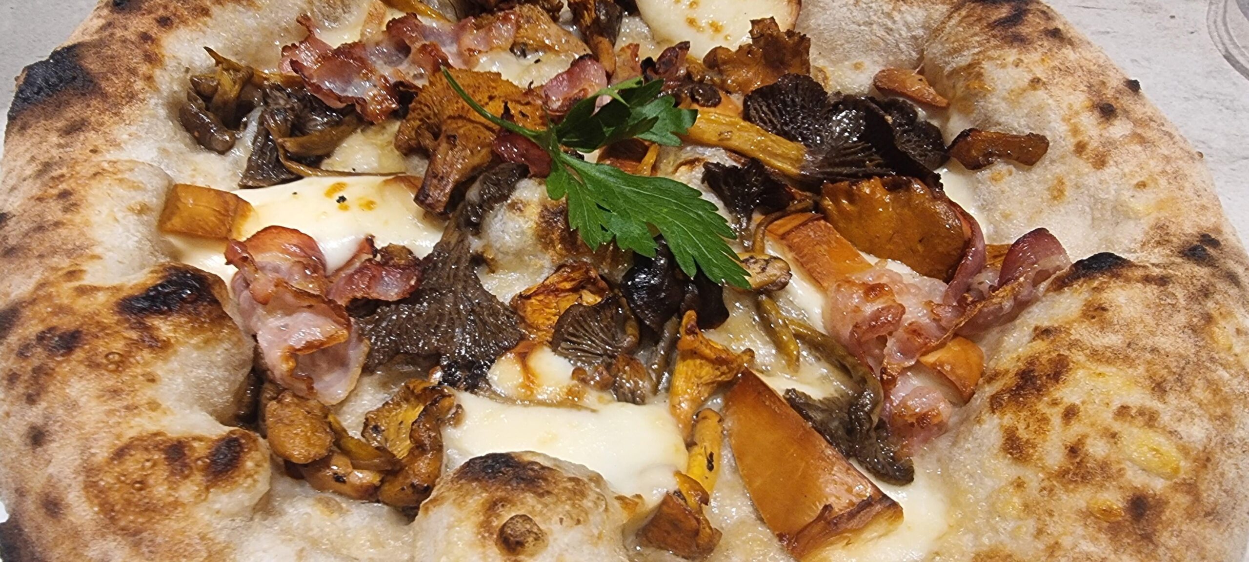 Contemporary Neapolitan "Forest" Pizza: fior di latte mozzarella, smoked scamorza, porcini mushrooms, chanterelles, bacon.