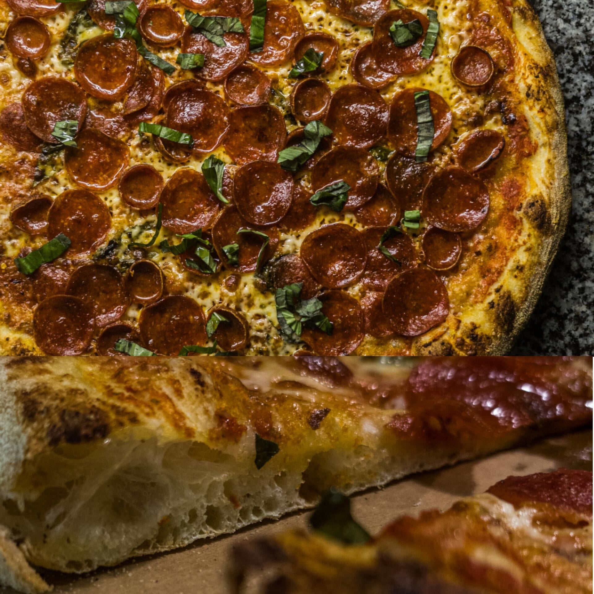 I think better lighting and 2 photos would help me admire the pizza better. Doesn’t look like the NY pizza Ive had but absolutely looks amazing (looks way fancier than a street slice). Did you use 2 different pepperoni types? Also very curious what your oven temp was and if it was gas/electric