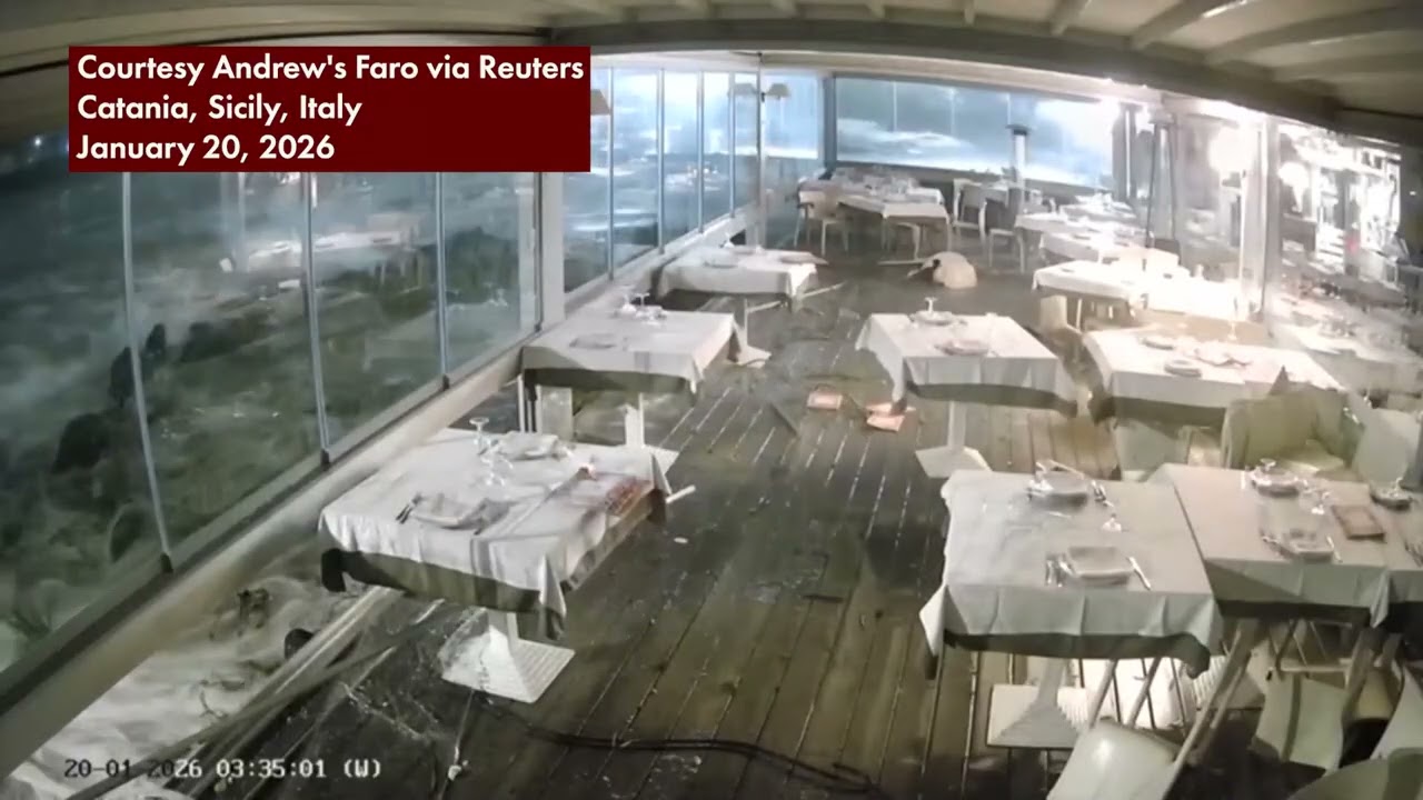 Sapul sa CCTV ang pagsalpok ng storm surge sa isang Italian seafront restaurant sa lungsod ng Catania sa Sicily, Italy. Nangyari ang insidente sa kasagsagan ng Cyclone Harry. | via Reuters