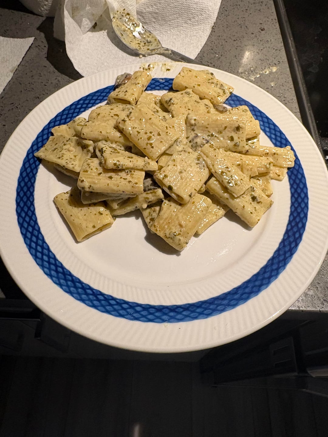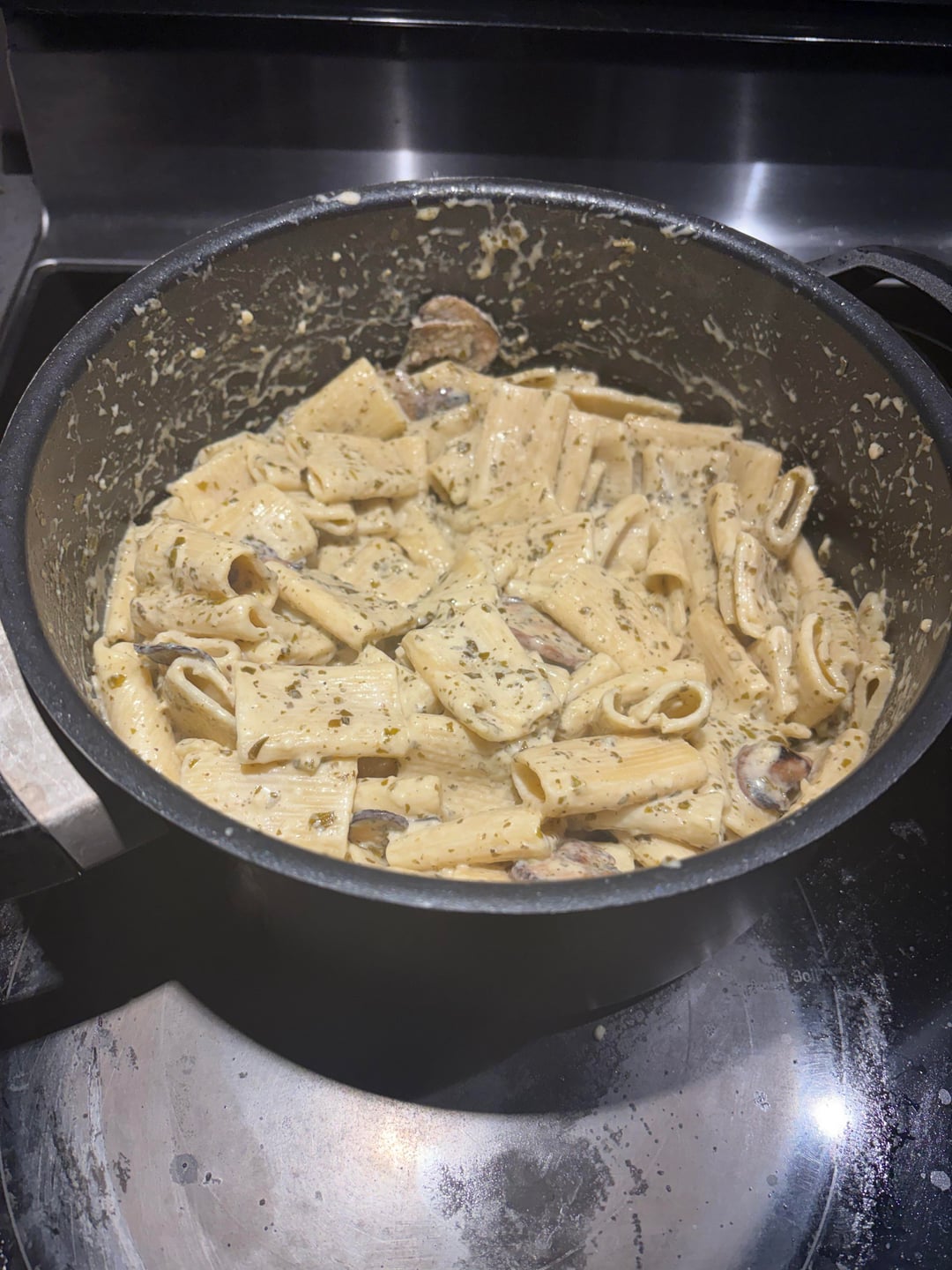 2) After draining the pasta, put the rigatoni, 3 tablespoons of butter, 3/4 cup whipping cream and sliced mushrooms in a large pan.
