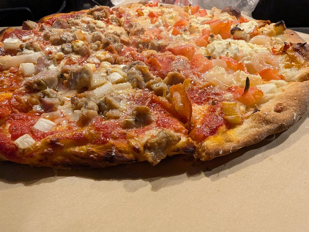 NY was same day dough. half: mozz first, my sauce, pepperoni, homemade Italian fennel sausage and onions; half: white pie with mozz, shrimp, onions, tomatoes, habanero and serranos. Fontina/parmesan sprinkle. 550F on steel.